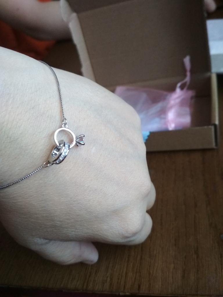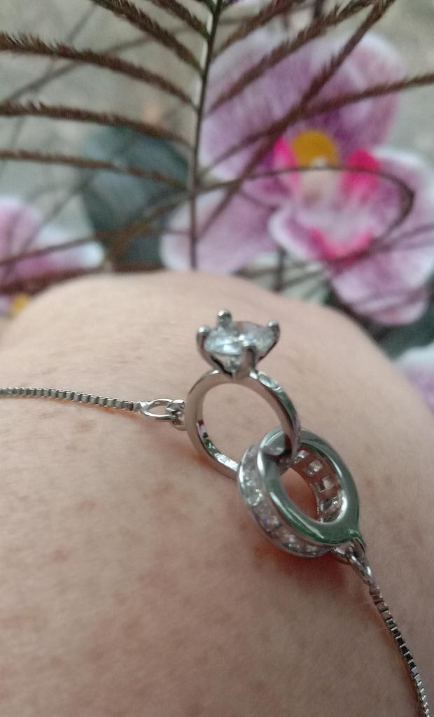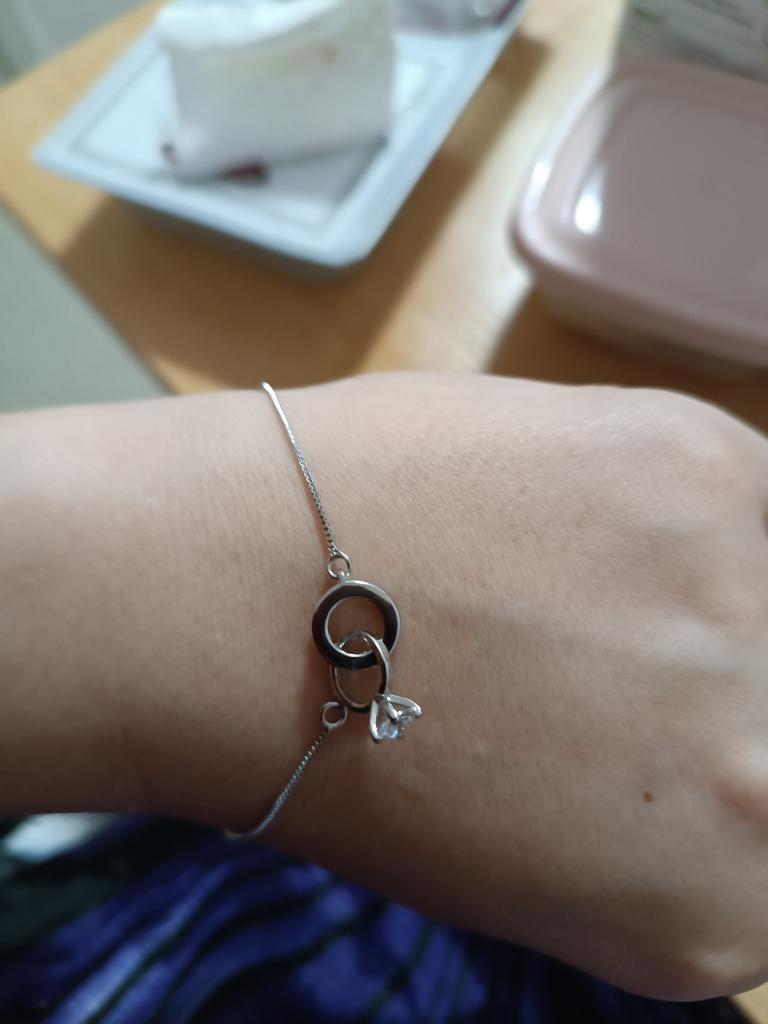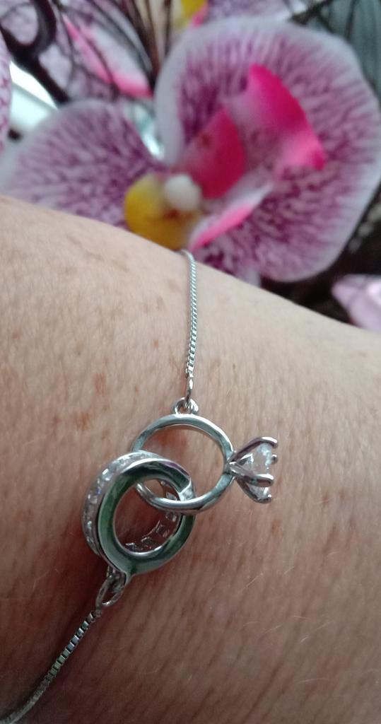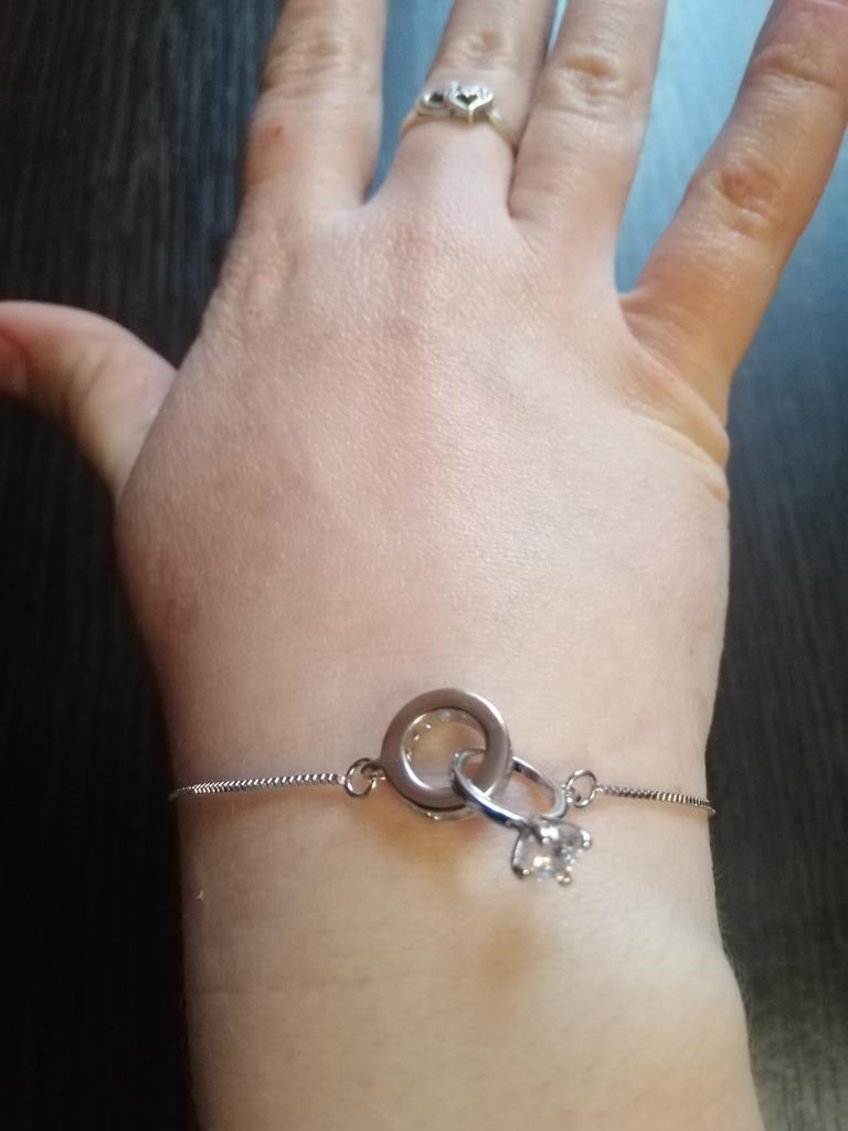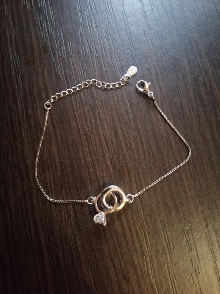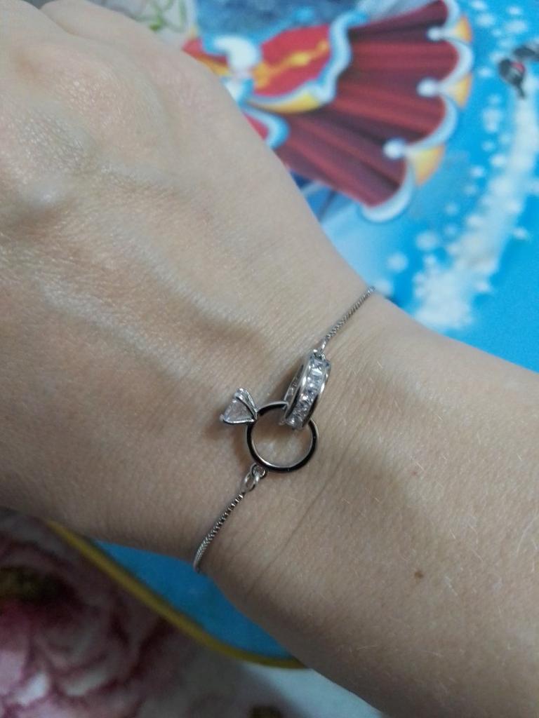 Silver bracelet from Lindon. It looks like a piece of jewelry, the length is adjustable, the alloy is zircon and copper. I really liked the pendants in the form of two rings, as if like wedding rings. The bracelet itself is thin and neat. Everyone is satisfied