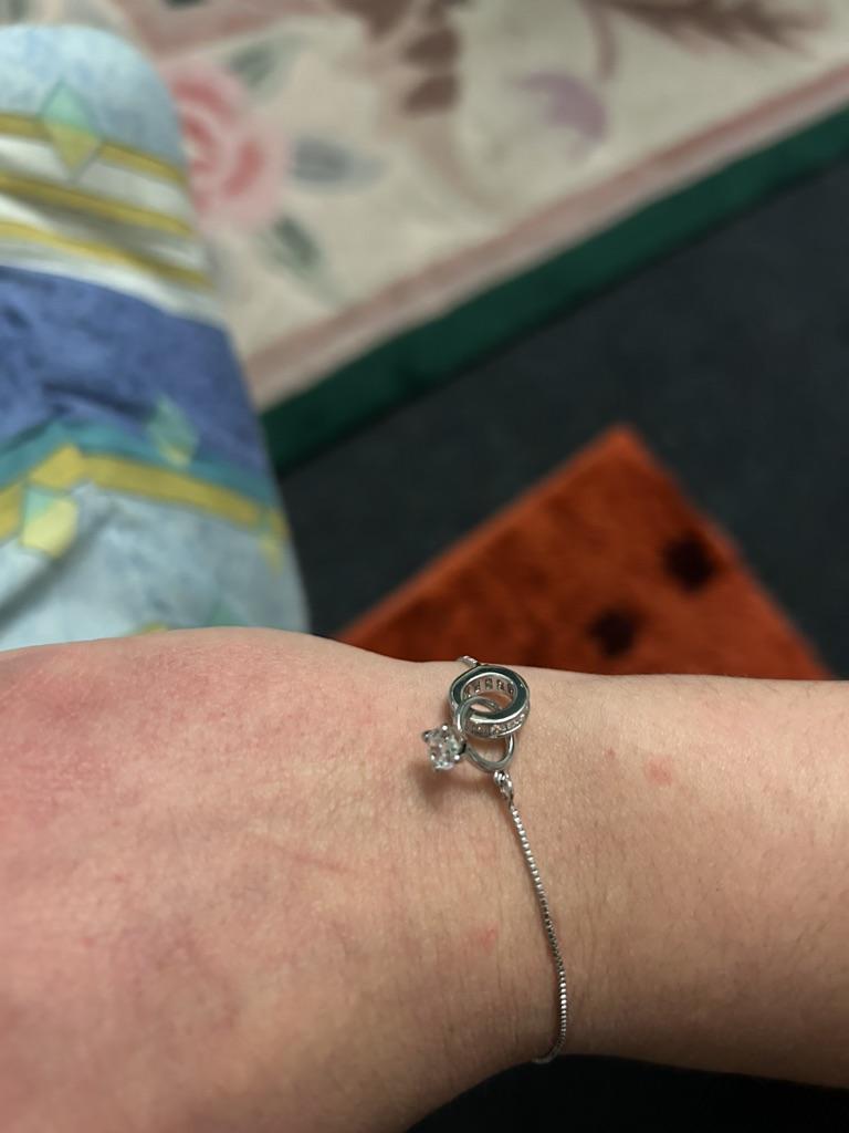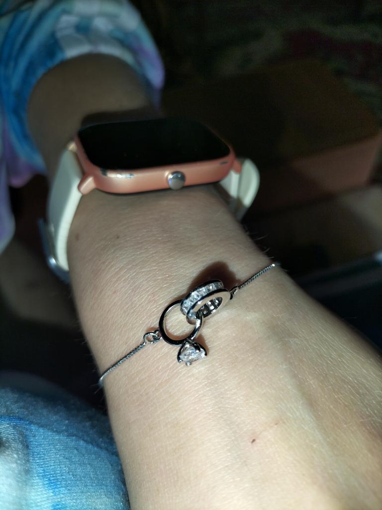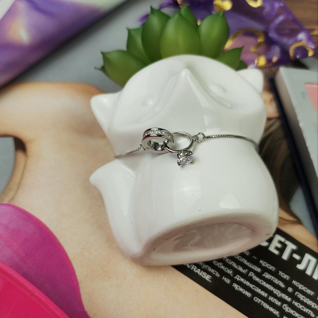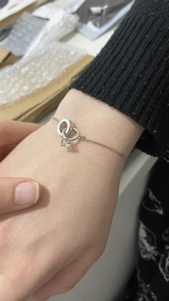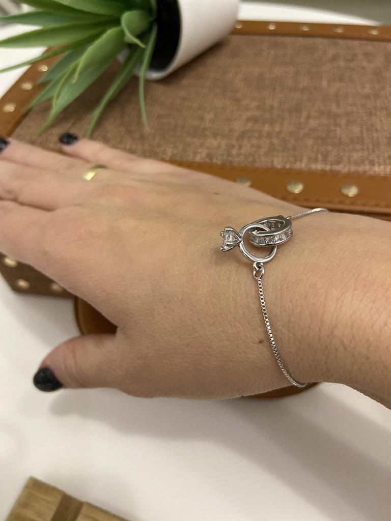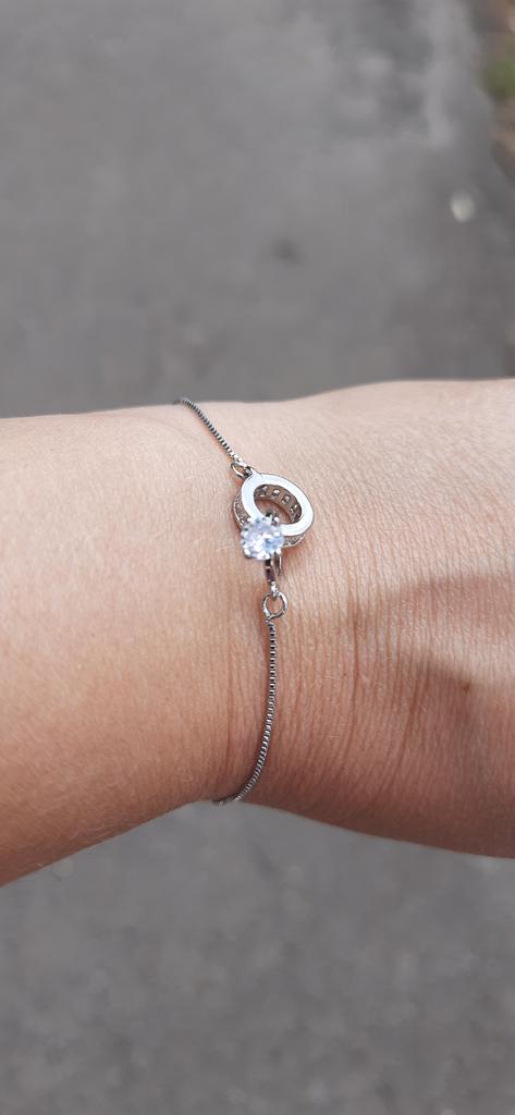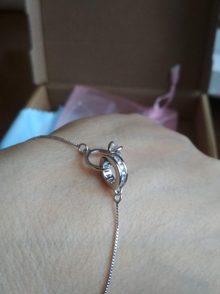 Silver bracelet from Lindon. It looks like a piece of jewelry, the length is adjustable, the alloy is zircon and copper. I really liked the pendants in the form of two rings, as if like wedding rings. The bracelet itself is thin and neat. Everyone is satisfied