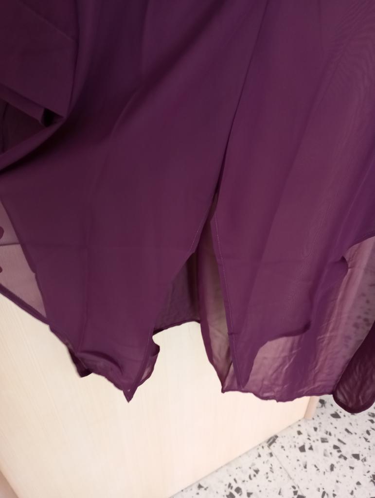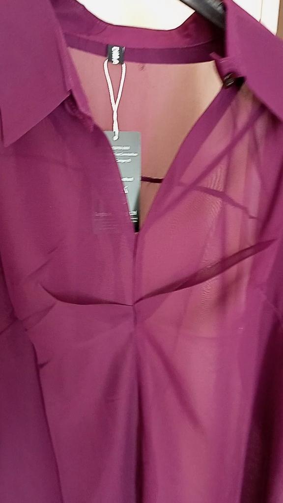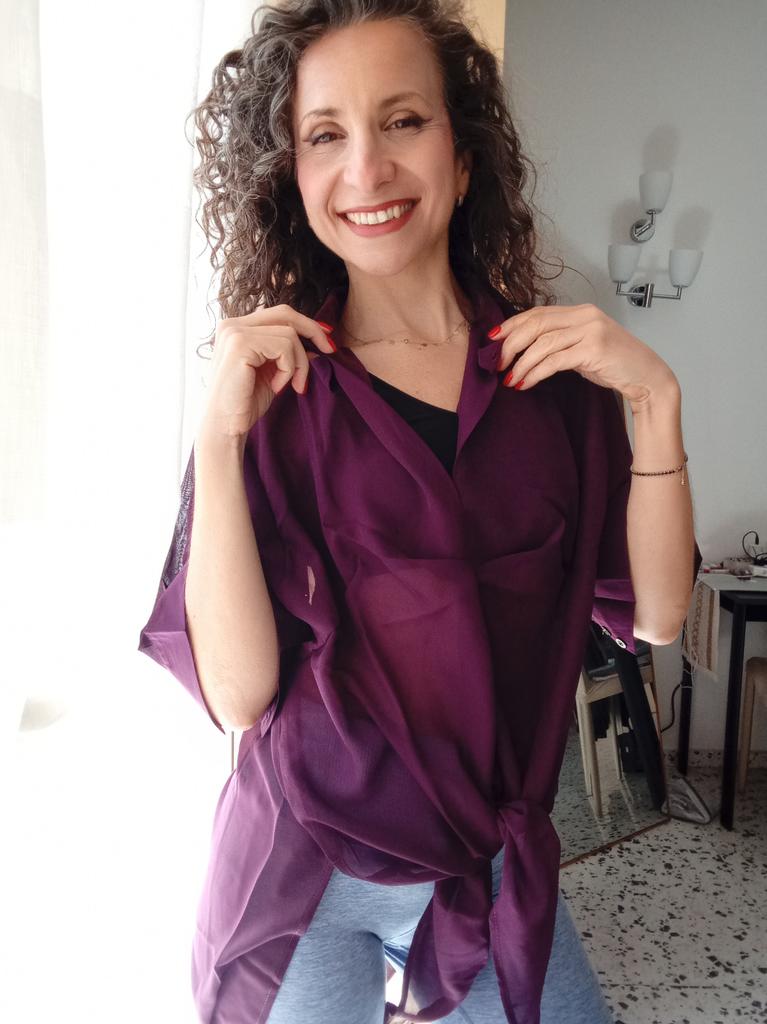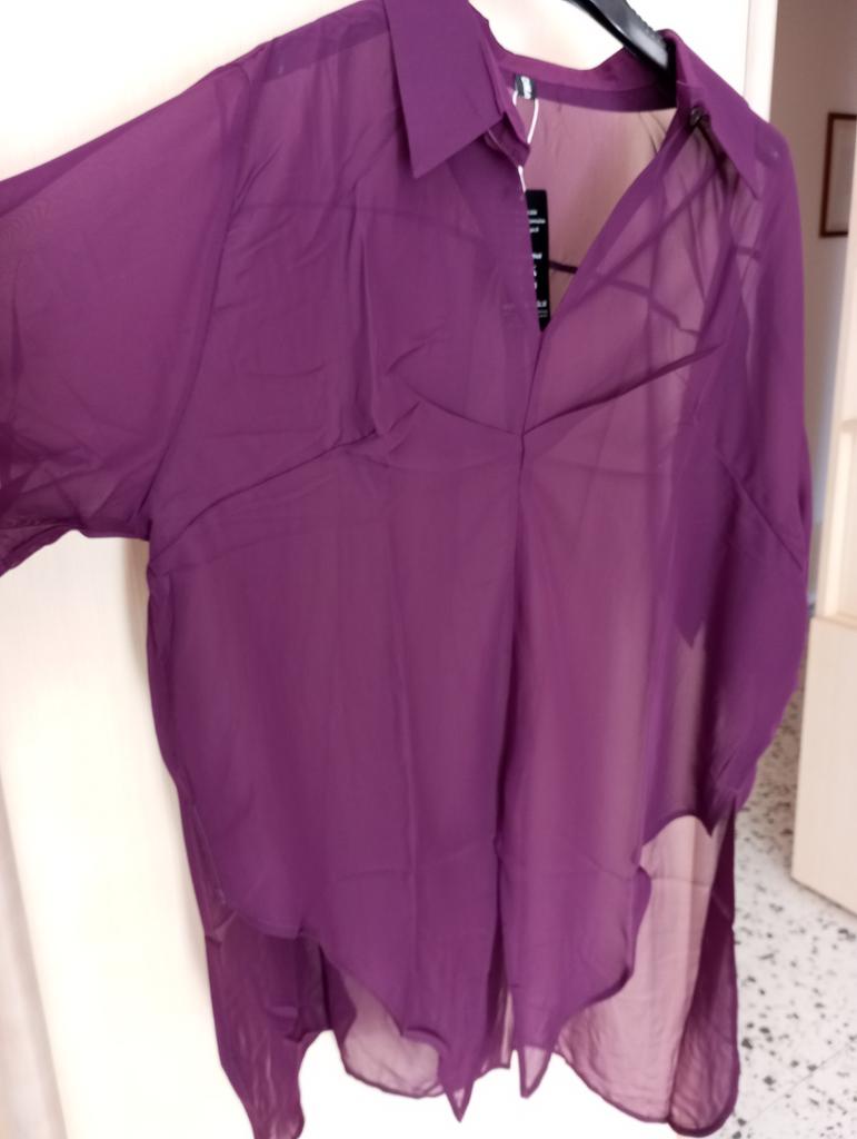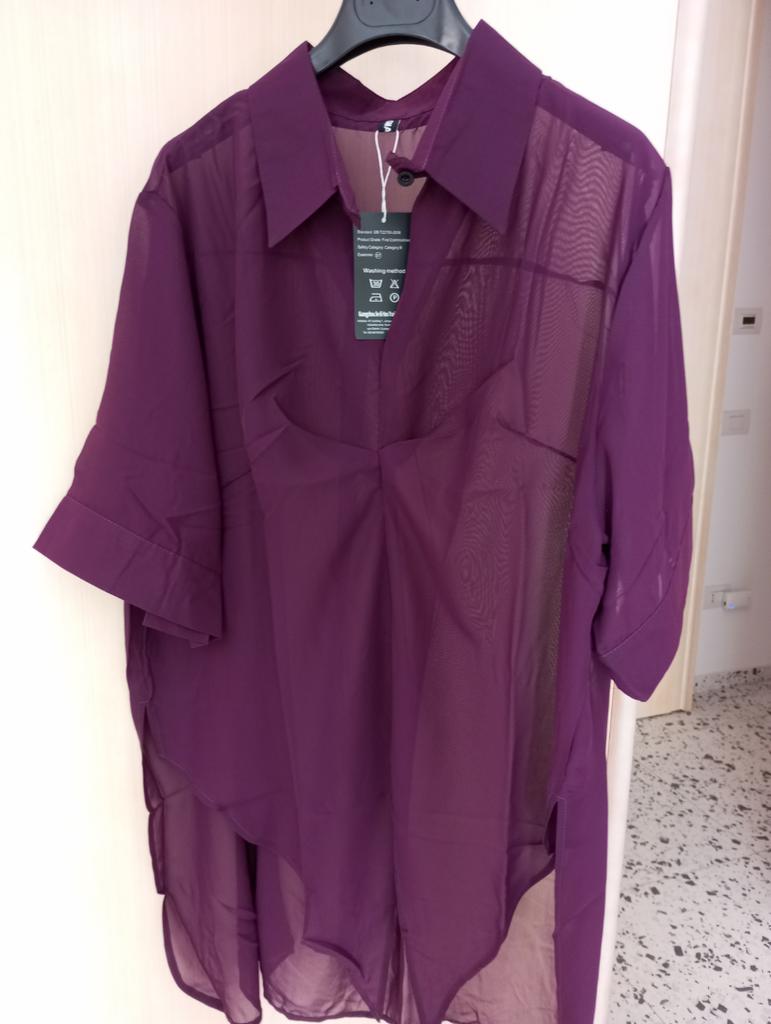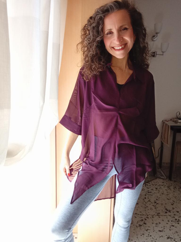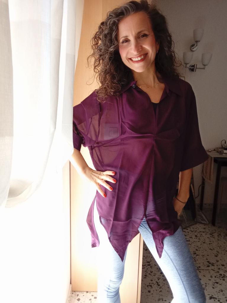 Chic Tunic in Silk Blend – Elegance and Versatility! ⭐⭐⭐⭐⭐ Material and Fit: I was enchanted by the lightness of this tunic. The mix of cotton, polyester, and a percentage of silk makes it incredibly soft, fluid, and comfortable against the skin. The fabric is semi-sheer (as seen in the photos), which adds a touch of refined sensuality without being excessive. I recommend wearing it over a basic tank top or a top for a layered look.. One Size: Being a one-size-fits-all, I was a little doubtful about the fit, but it turned out to be a pleasant surprise. The cut is loose and draped, which makes it perfect for different body types (it fits comfortably from an S to a generous L). As you can see from the photos, it looks good both left to hang loosely as a long tunic, and tied at the waist for a more playful effect and to define the silhouette.. Color and Design: The color is a beautiful deep and intense eggplant. The shirt collar and V-neck give it a very chic and sophisticated air. It's a super versatile piece: perfect to pair with a pair of light jeans and ballet flats for an elegant daytime look, or with black trousers and heels for a special evening.. Conclusions: Excellent value for money for a garment that includes a precious component like silk. It arrived well-packaged and on time. An purchase I absolutely recommend to those looking for a unique, comfortable, and elegant garment.💖💖💖