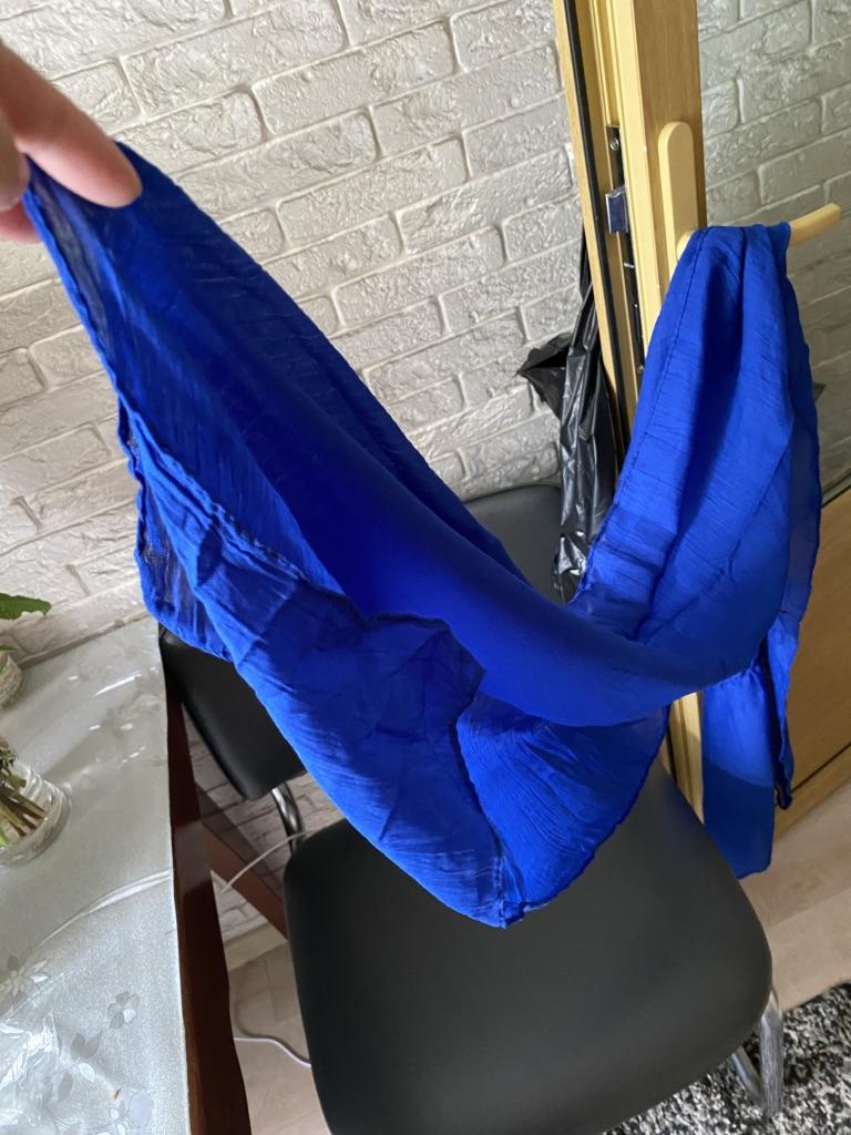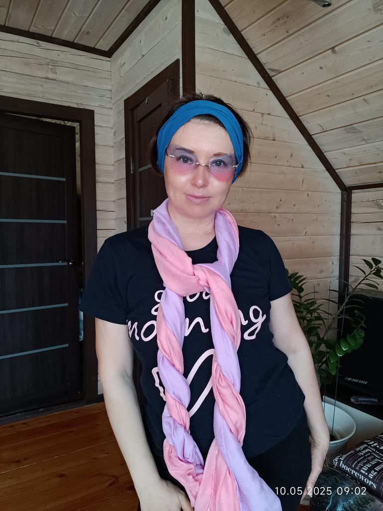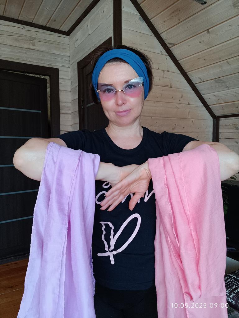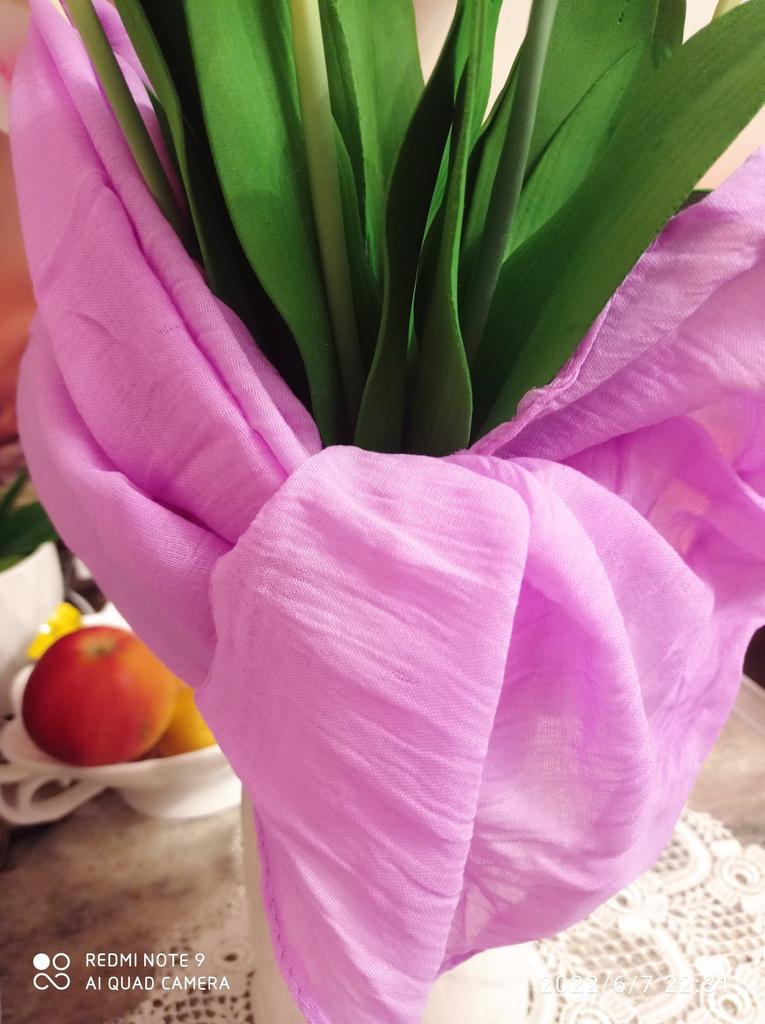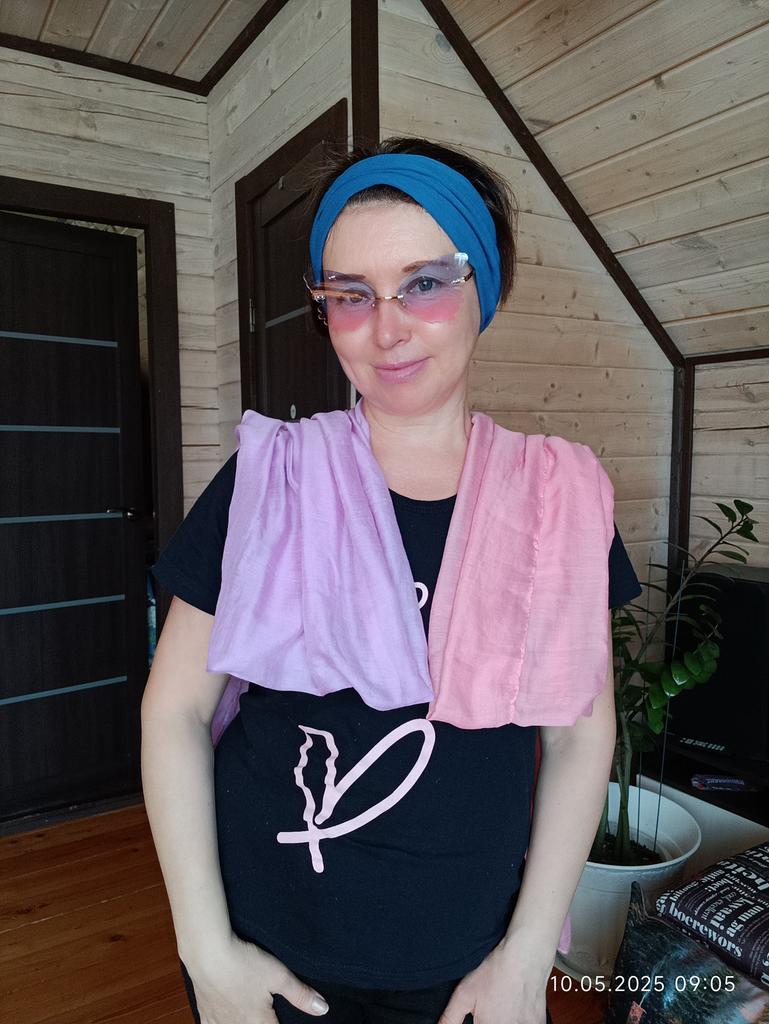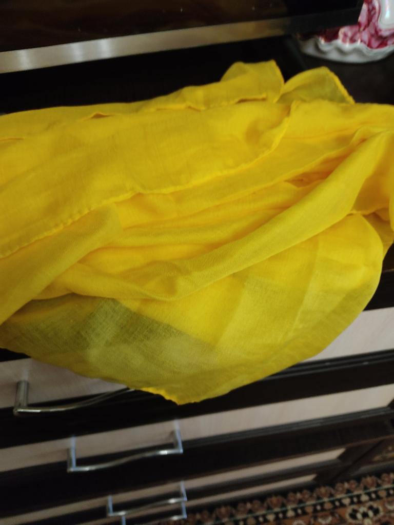 The scarf is not wide - it does not pull on a shawl. The fabric is thin and very pleasant. This is the biggest plus of this scarf. The edge is processed in a strange way - it gathers a little (i.e. the seam is not flat). This is a minus.