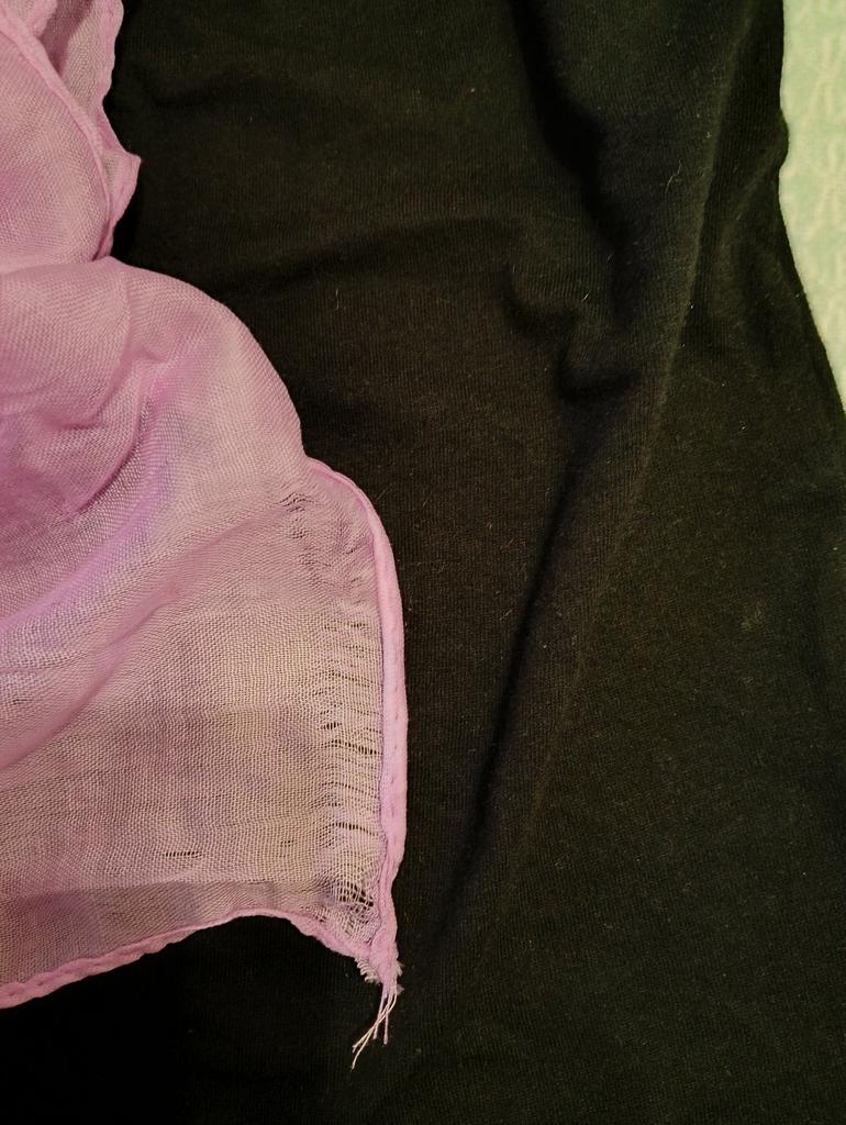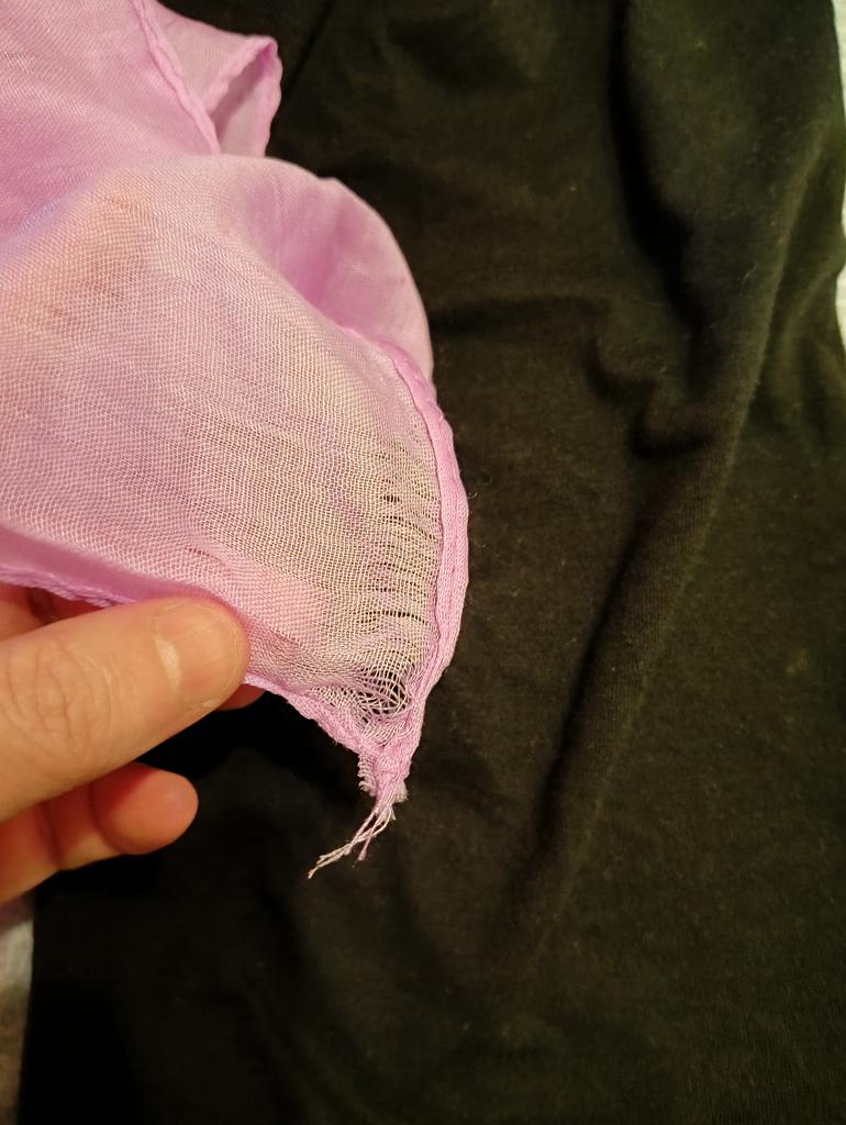 This is not a scarf, but a piece of fabric hemmed on all sides, and the fabric near the hem is torn in many places by the needle.