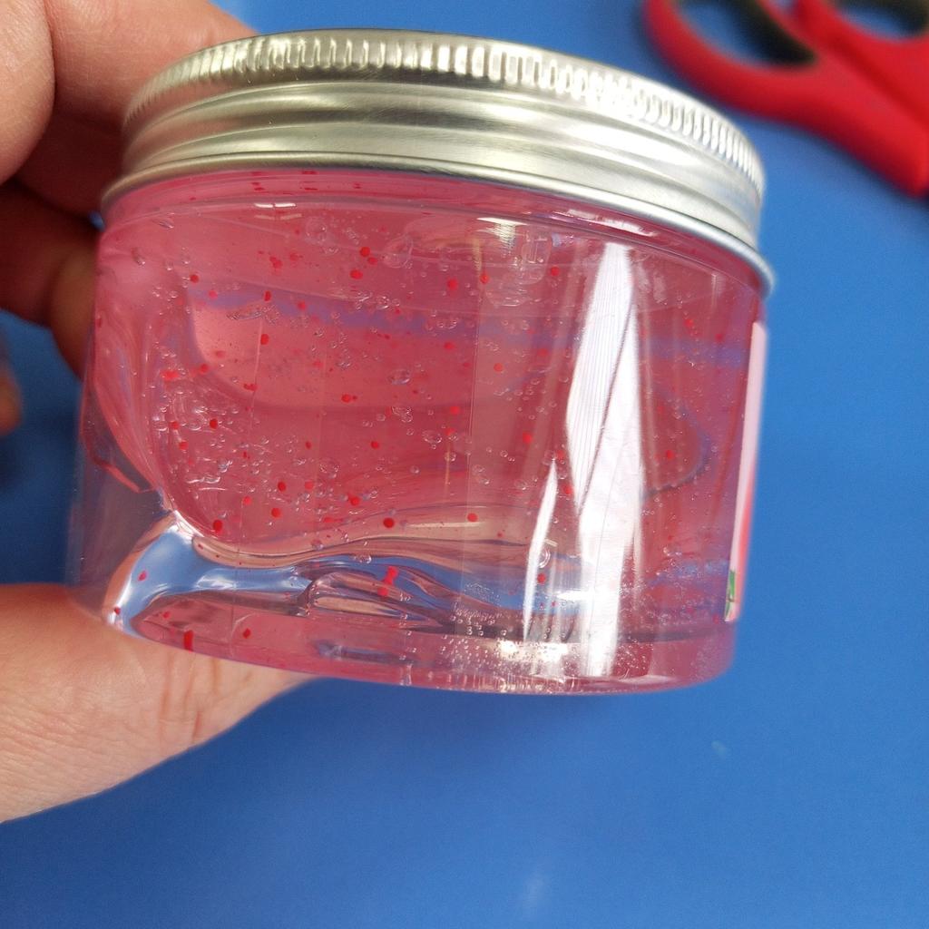 The jelly is transparent and very light. There is a spatula so you don't have to get your fingers in it.