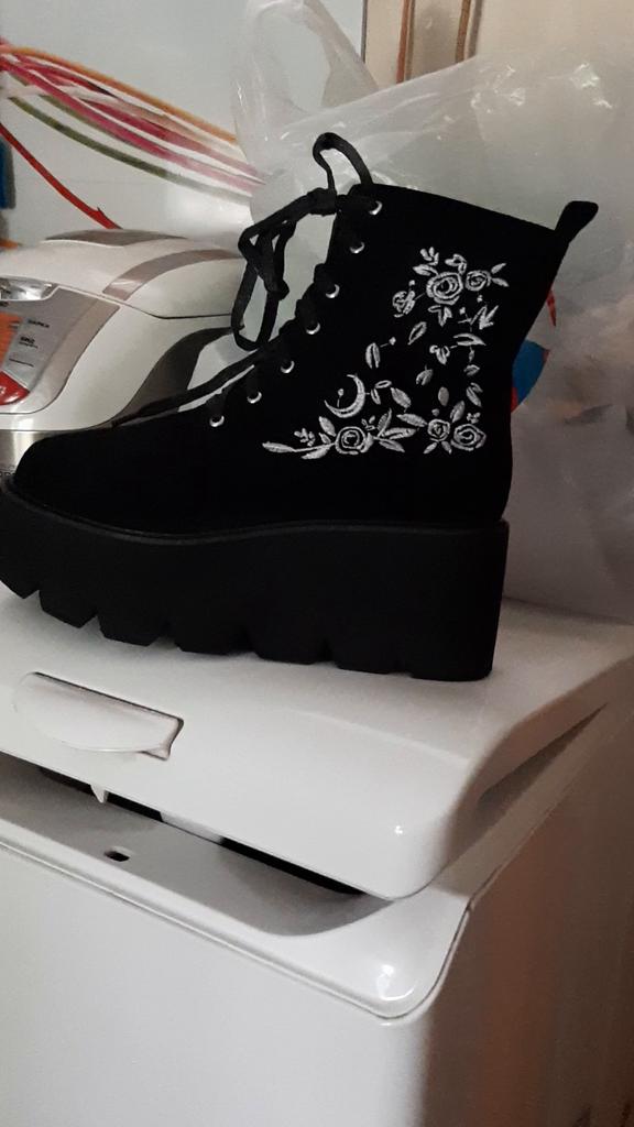 Retro Gothic Style Embroidered Flower Boots Women Platform Wedge Black Suede Heel Thick Bottom Ankle Boots With Zipper