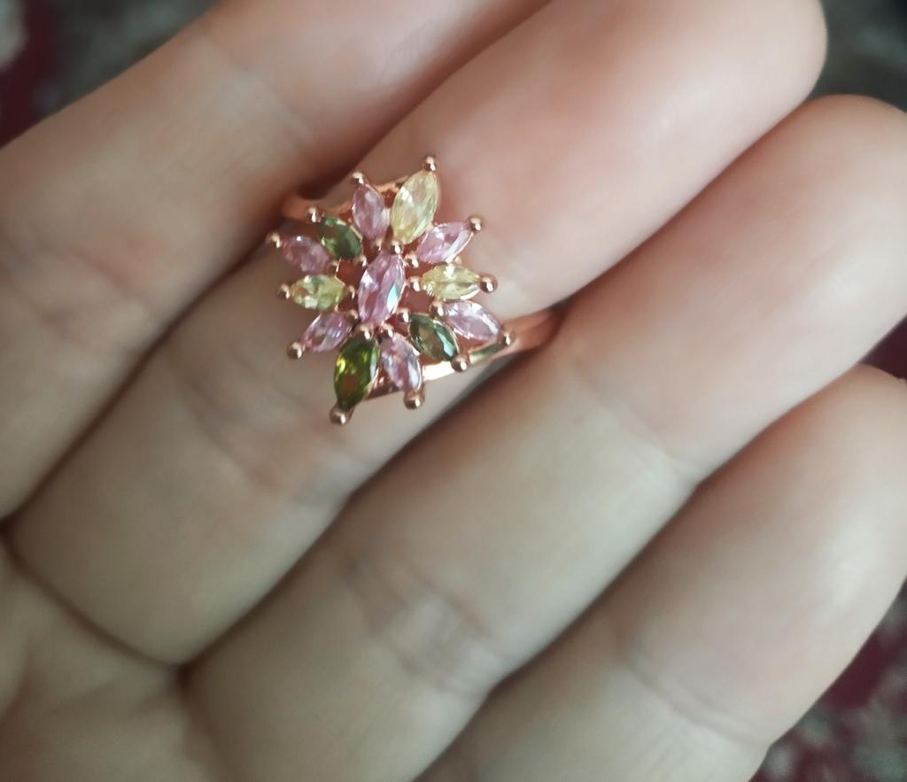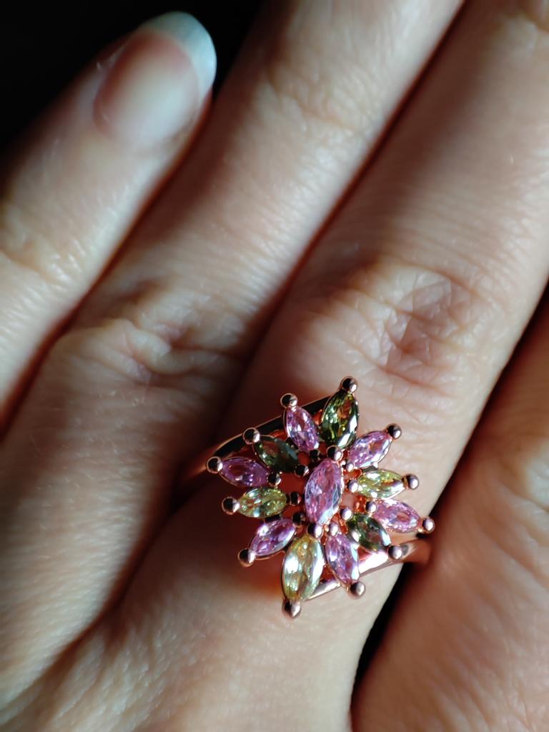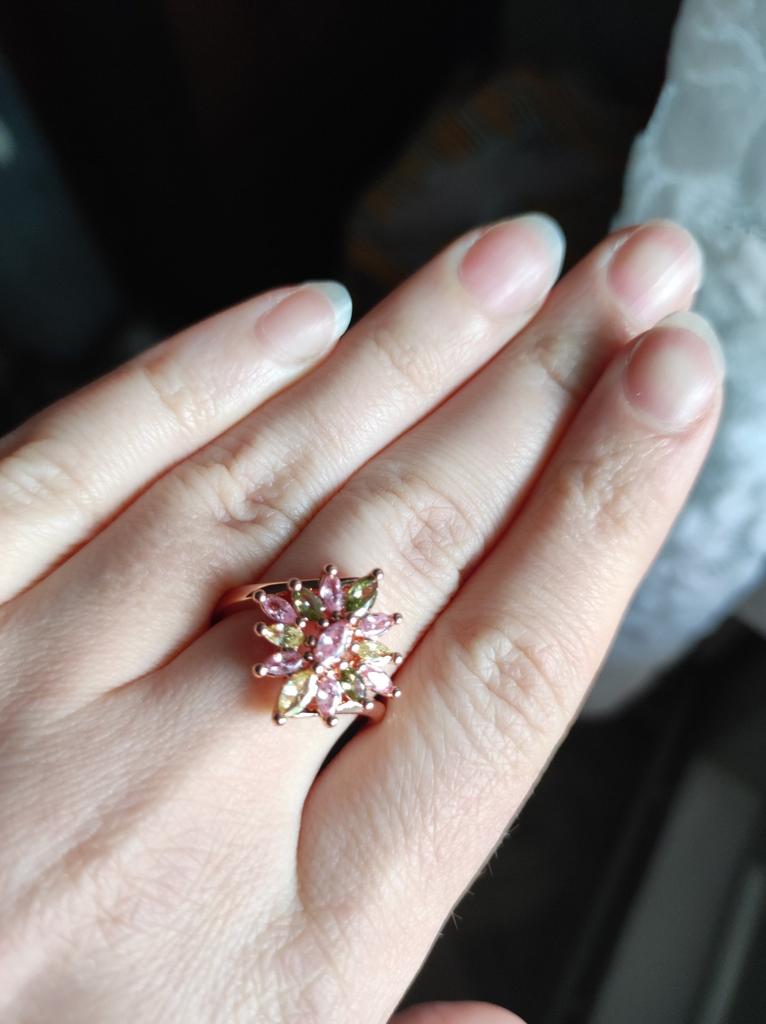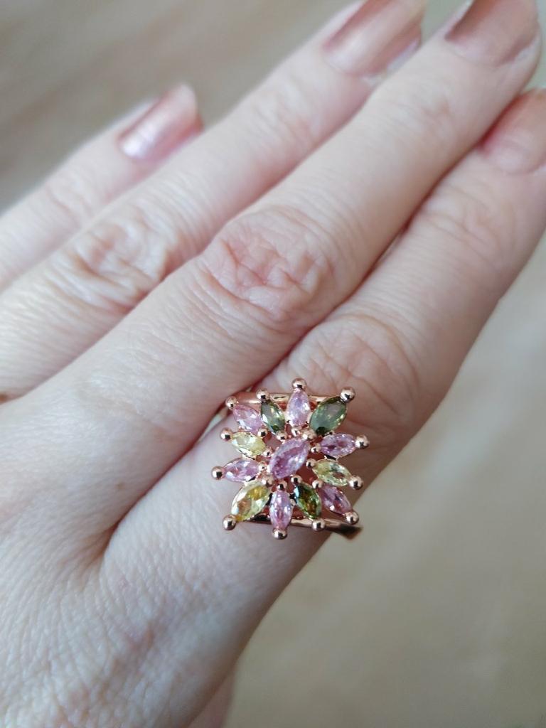 A very beautiful ring. The work is neat. The stones are soft but bright. It looks like a tourmaline ring. Even the pink gilding does not spoil it. Pleased.