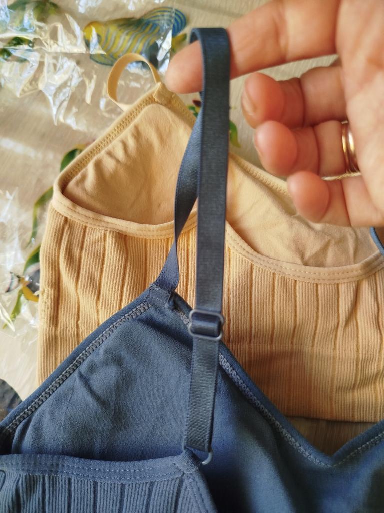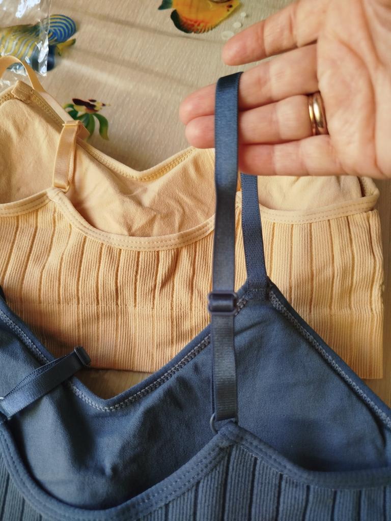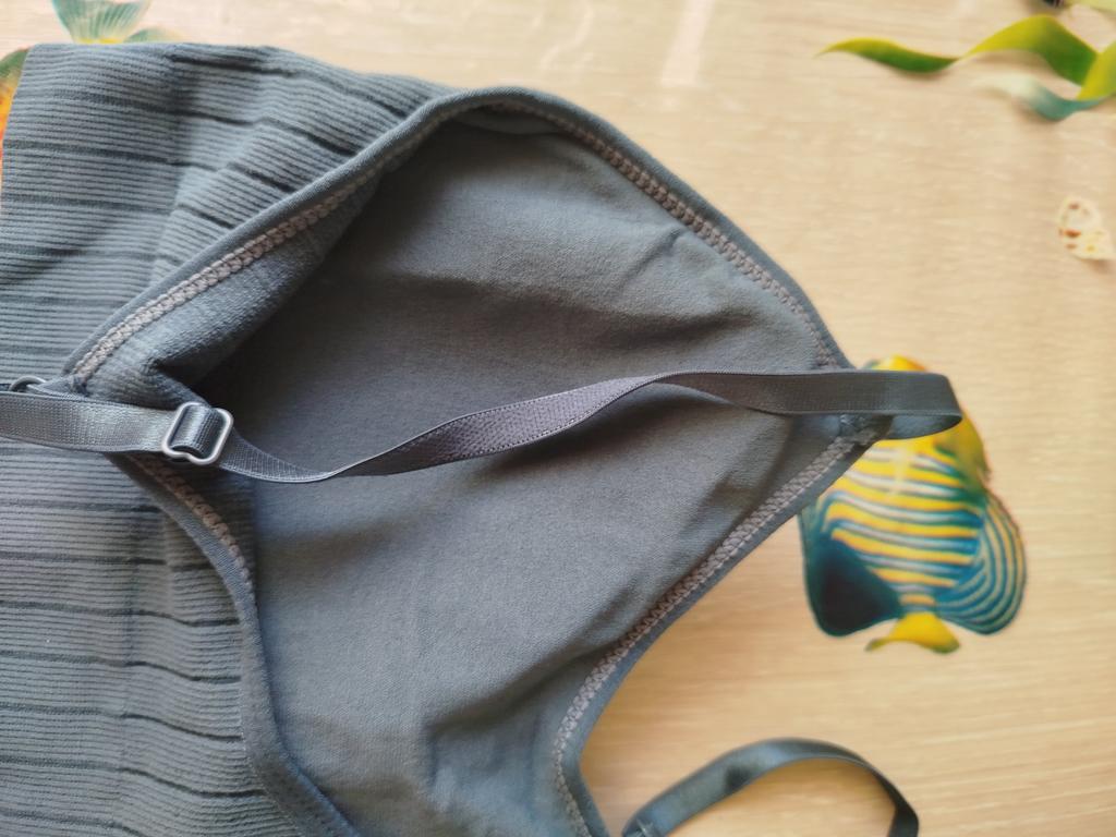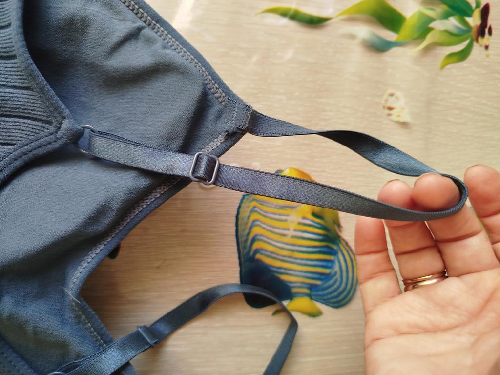 Very pleasant fabric, although not natural. The straps are adjustable, it is almost not felt on the body. The paralon is also removable, I really like it!