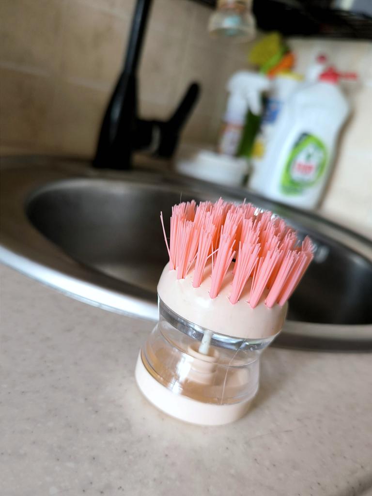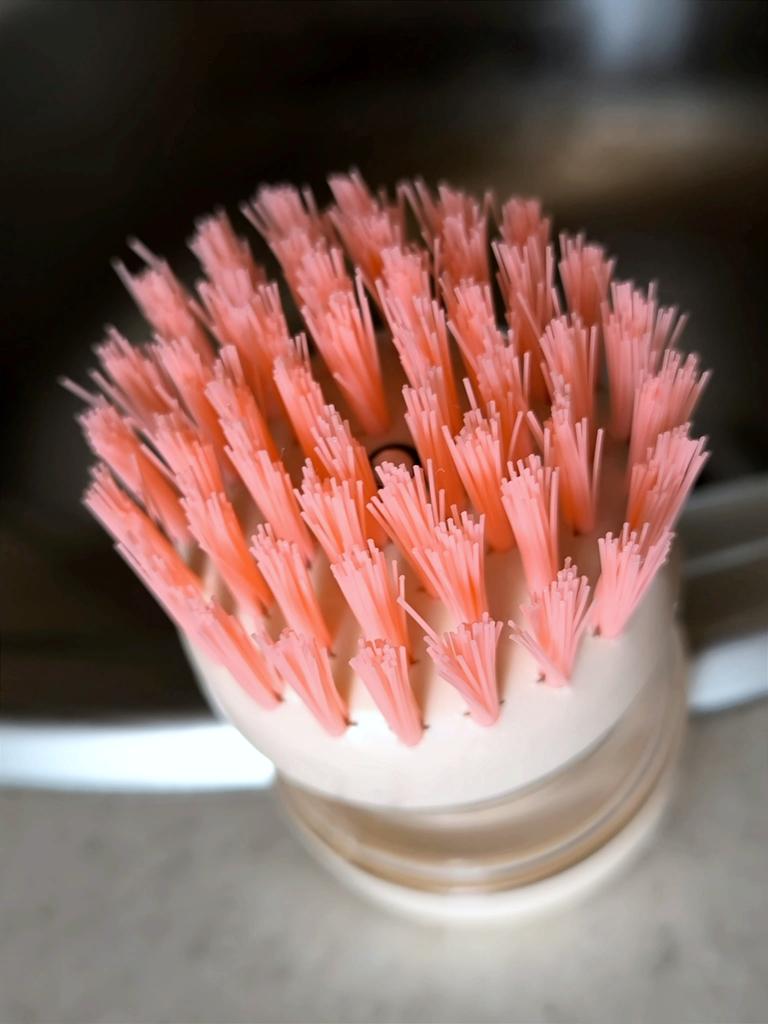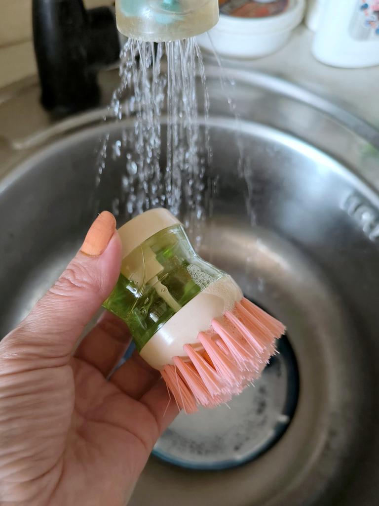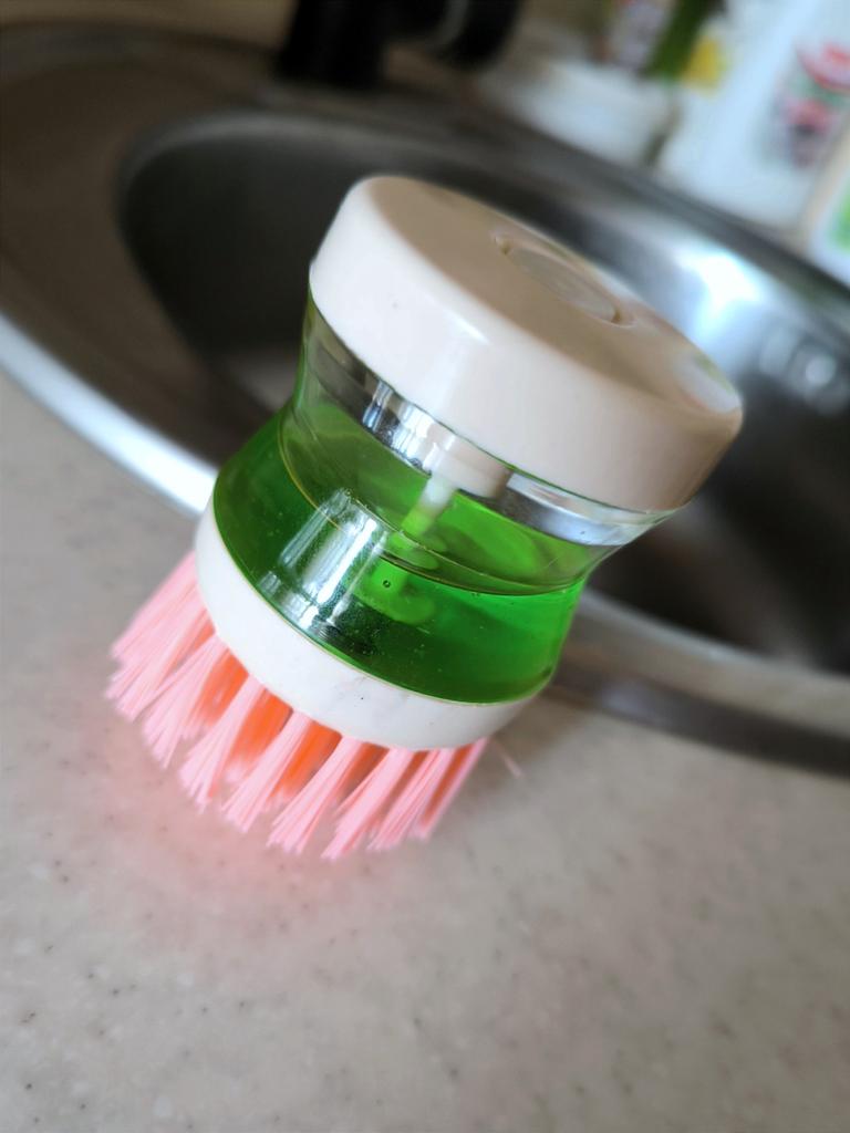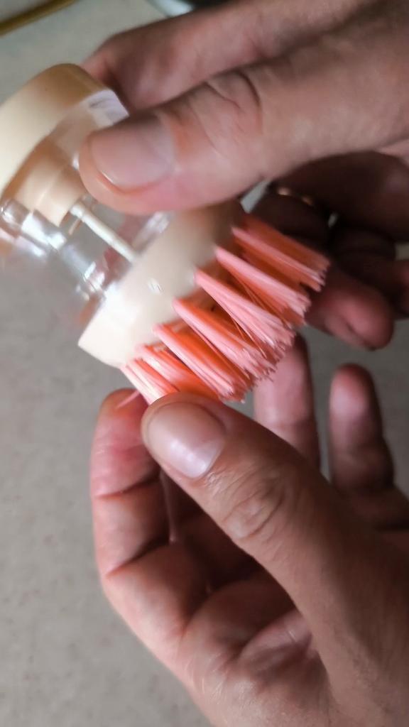 The brush is very hard, it is impossible to wash dishes with it. Plus the washing solution flows.