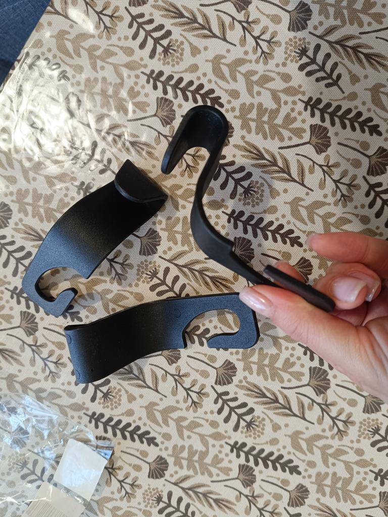 Convenient hooks. Strong enough. Good takeaway from the headrest strut. Rights I have thick seatbacks and takeaway is barely enough.