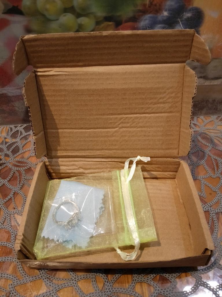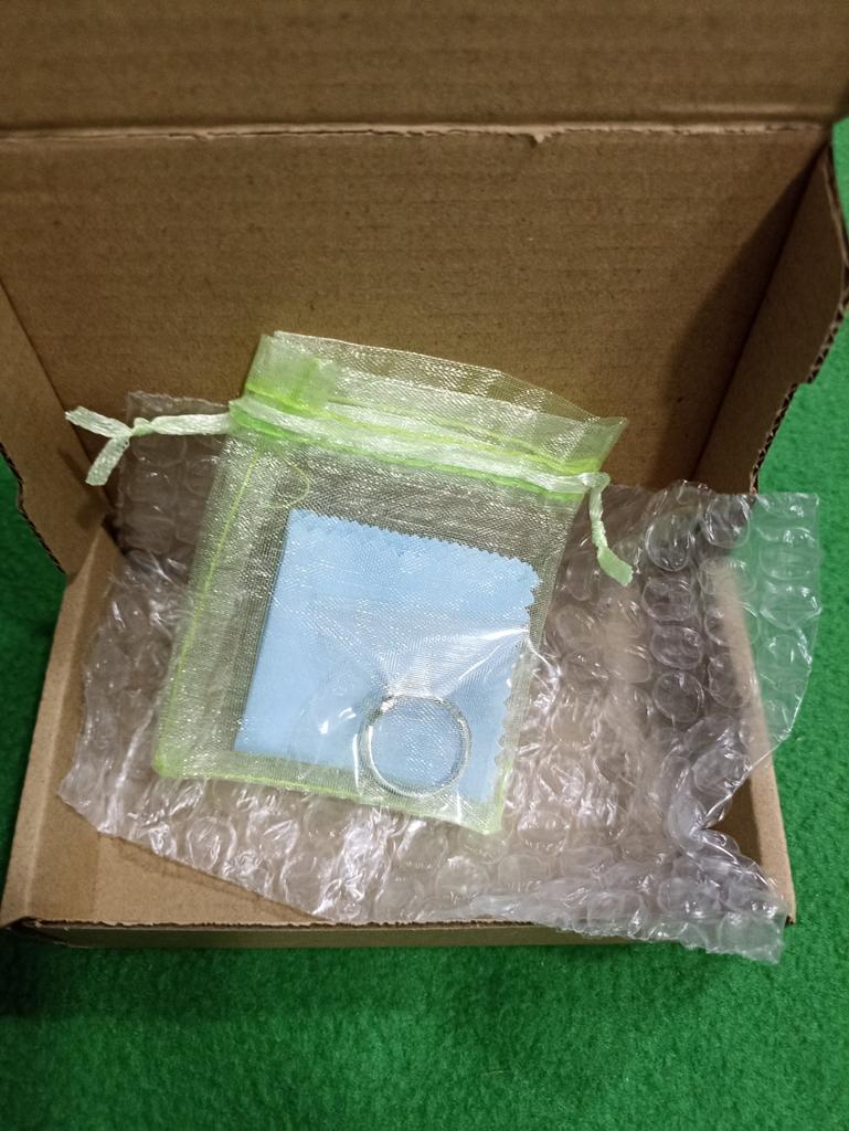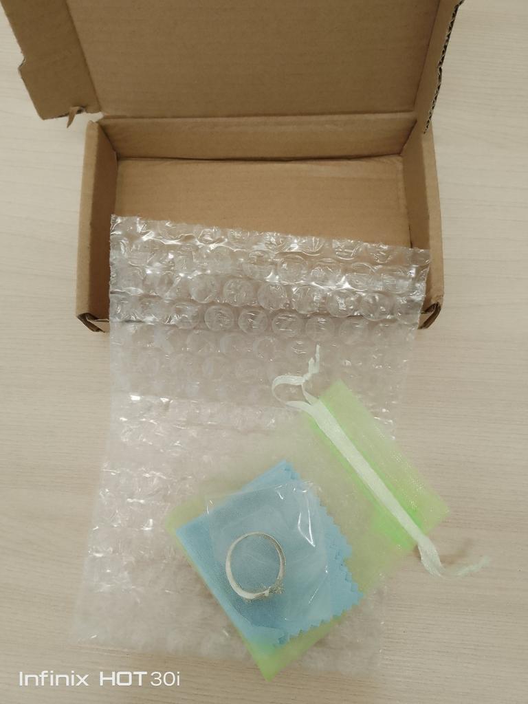 Box, bump, ball, bag, fabric. The packaging is classy and the ring is gorgeous, like silver. I recommend it. Thank you to the seller, Jum and everyone who collected the parcel