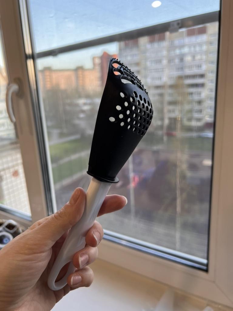Multifunctional kitchen spoon The spoon is made of durable heat-resistant plastic. Dimensions: 23*7.5cm. This spoon can be used for: β removing dumplings, dumplings, pasta, vegetables or meat from hot water. β removing foam from broth during cooking β use as a masher - for making purees, vegetables, fruits (in small quantities). β also, thanks to the hard spikes on the bottom outer part of the slotted spoon, you can quickly chop garlic, ginger, etc.. Itβs not for nothing that this spoon is multifunctional and can easily replace several items in the kitchen.. Satisfied with the order. I recommend!