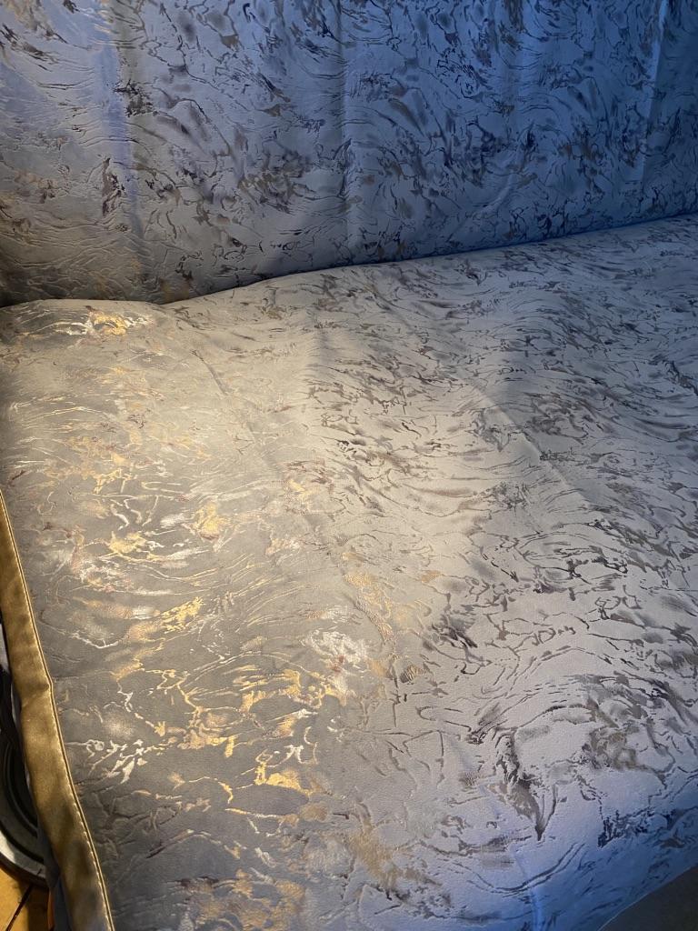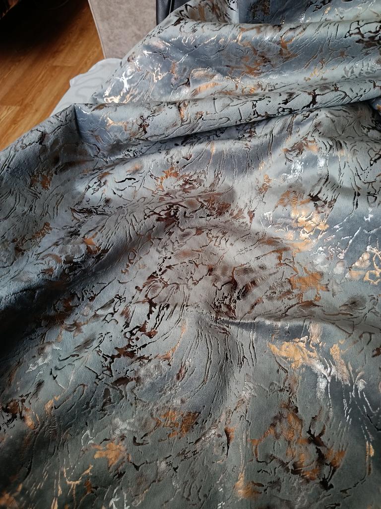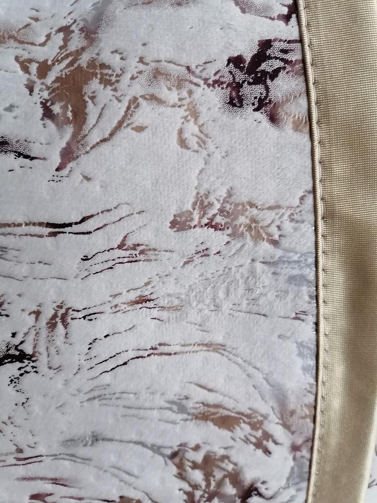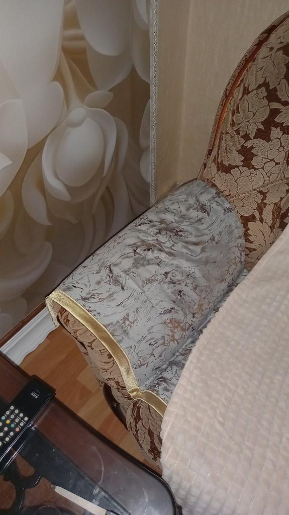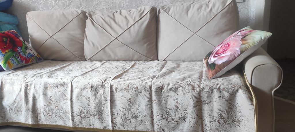 Very beautiful pattern and pleasant fabric. Does not stick to the sofa upholstery at all, this is a deception. The size is on the edge, the promised 70 cm width - barely 69.5.