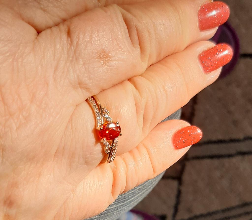 The ring is beautiful, with a red stone, a delicate border of white crystals.