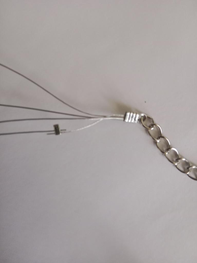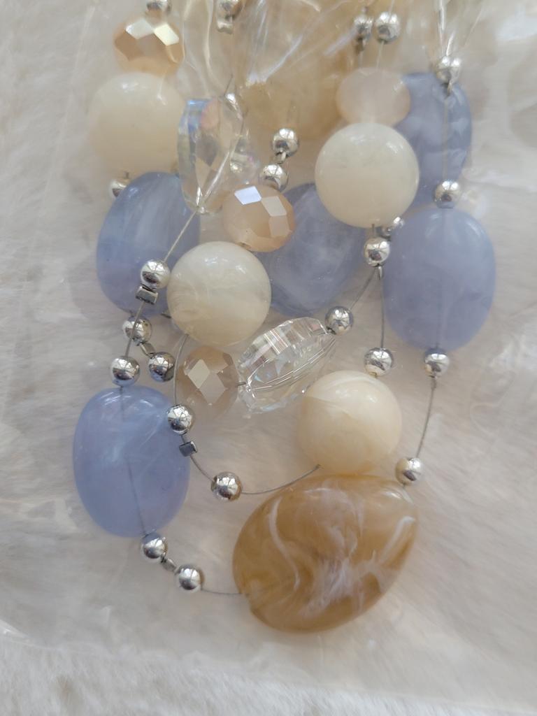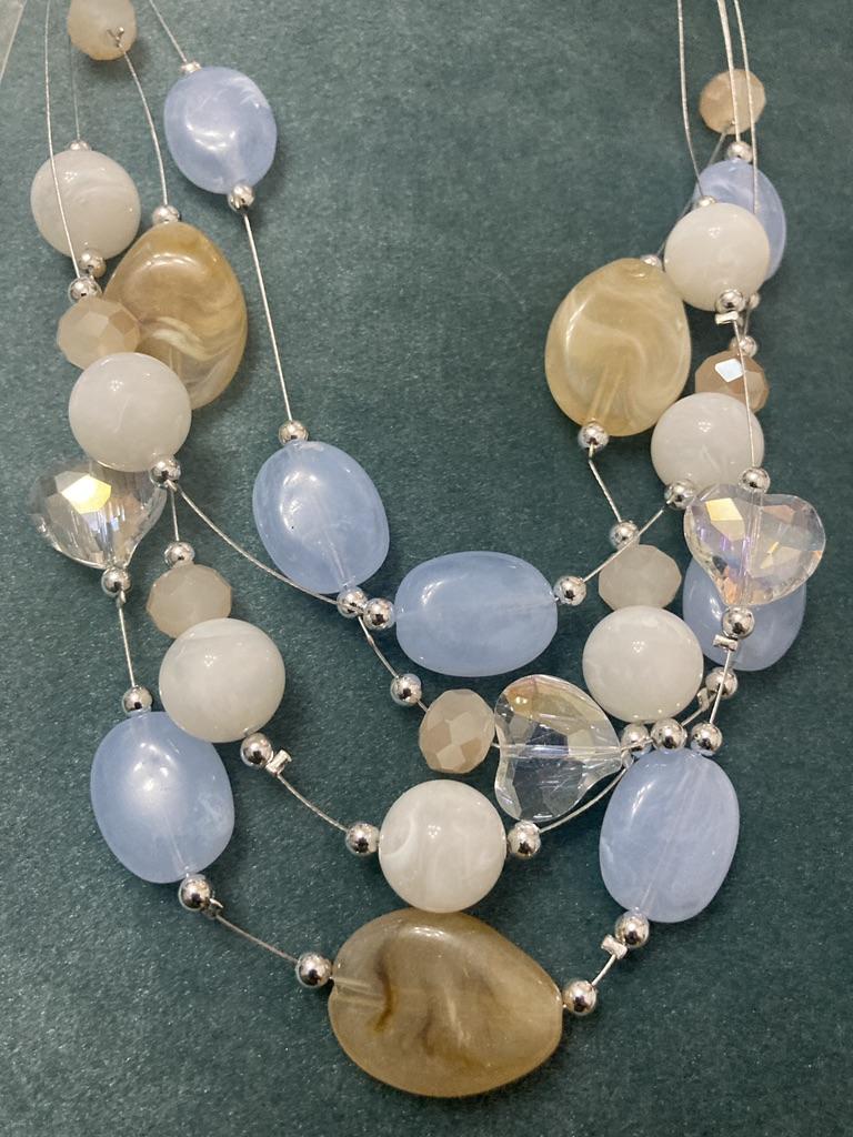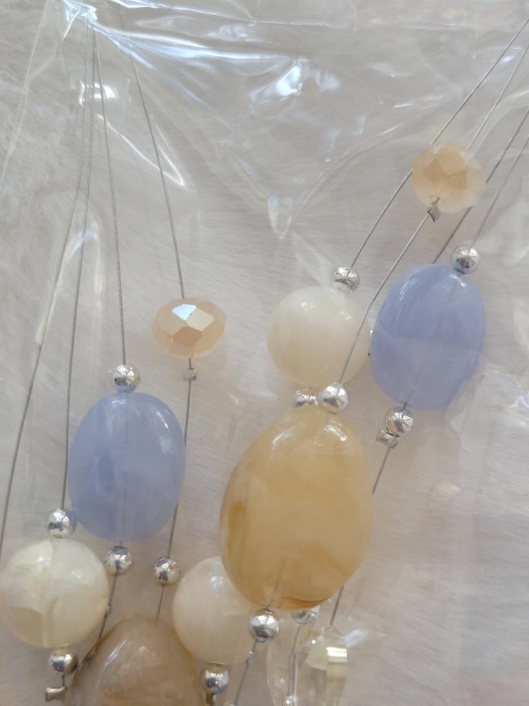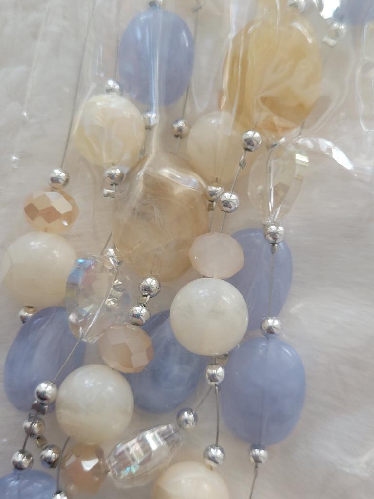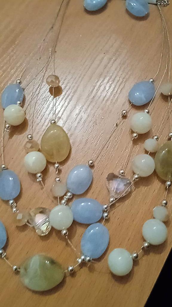 The necklace consists of four strands with beads. Three strands are made of the same length, so all the beads are on top of each other. It's not pretty! It doesn't look like this in the photo.