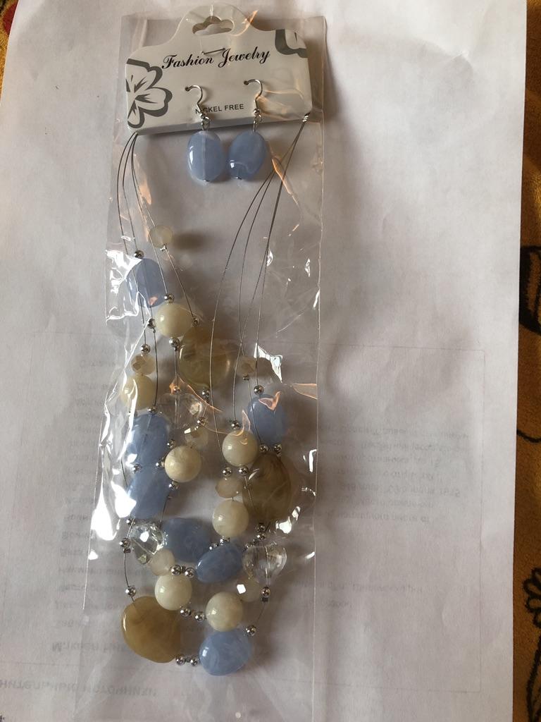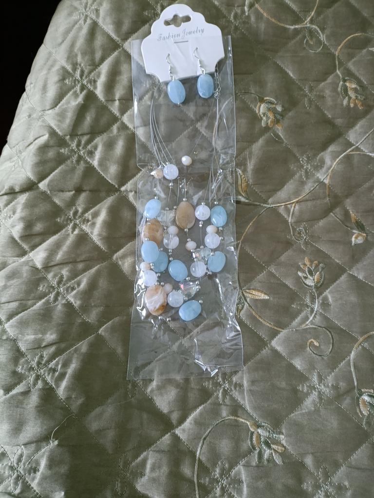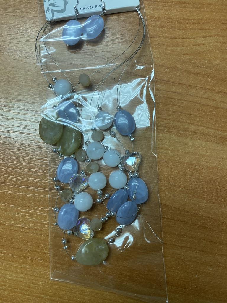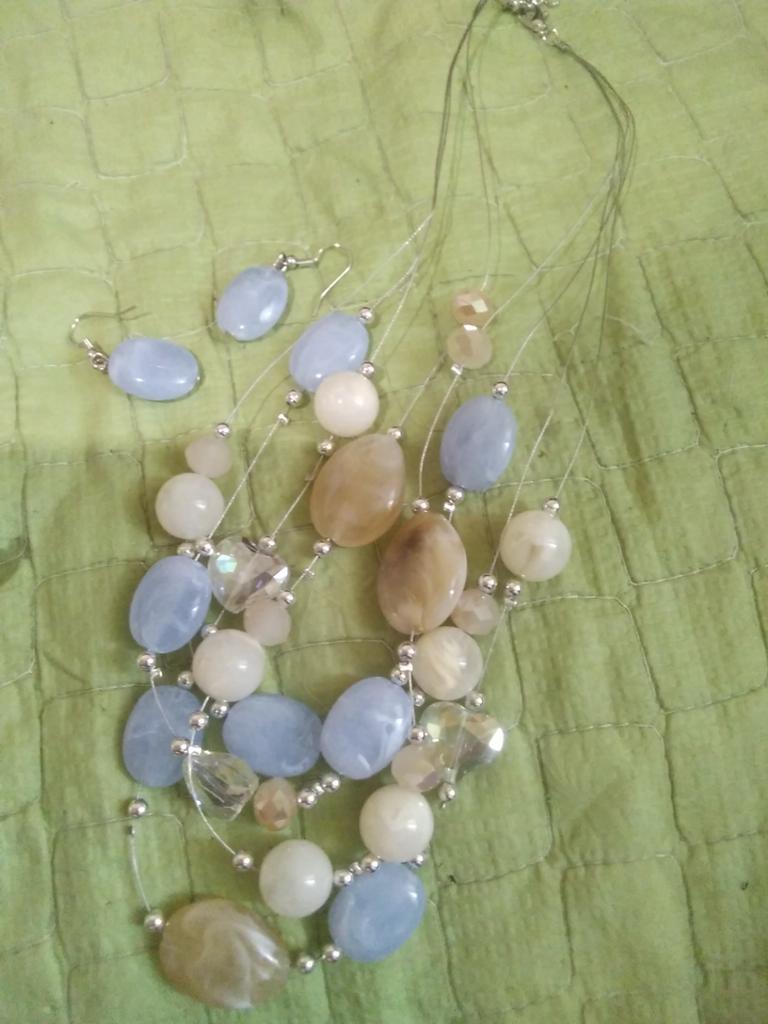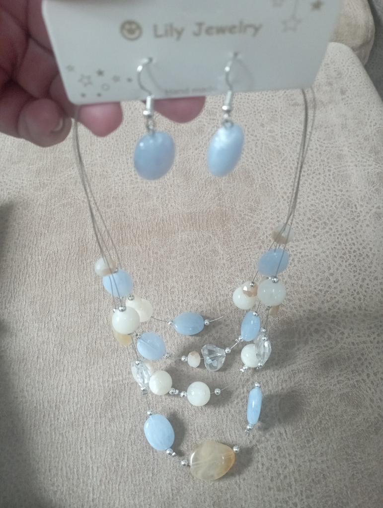 The set is beautiful, delicate. True, the blue beads are not blue, but some kind of gray. But still beautiful. Thank you.