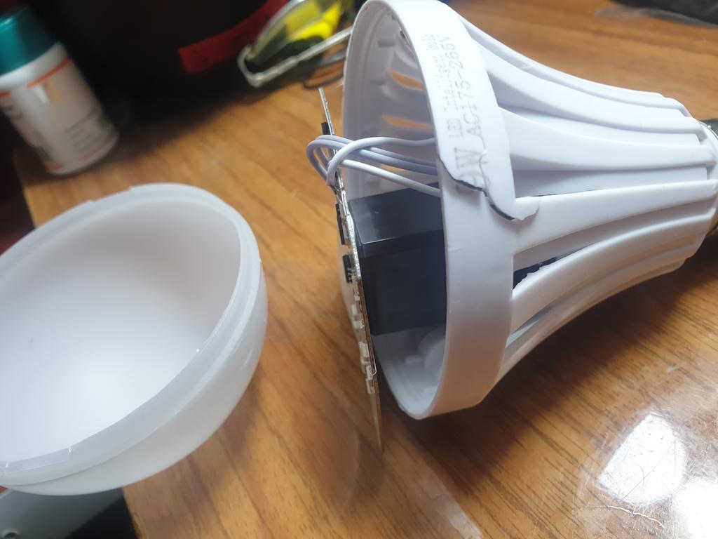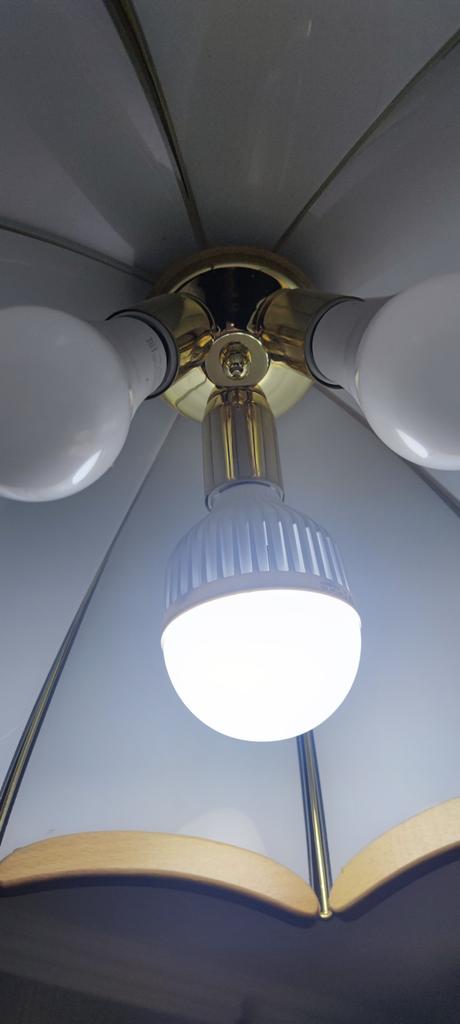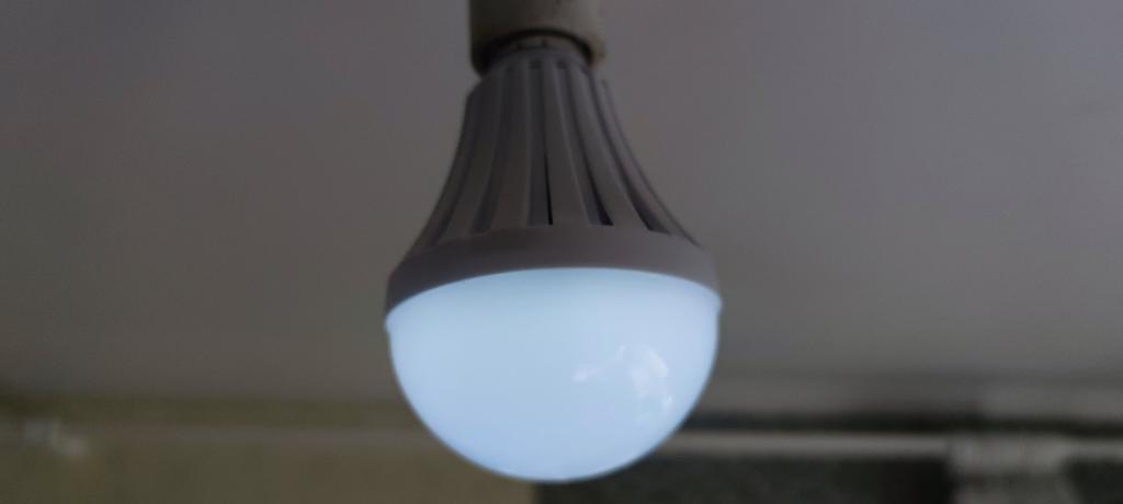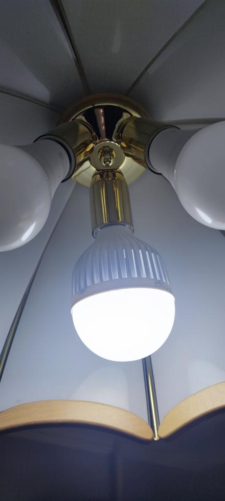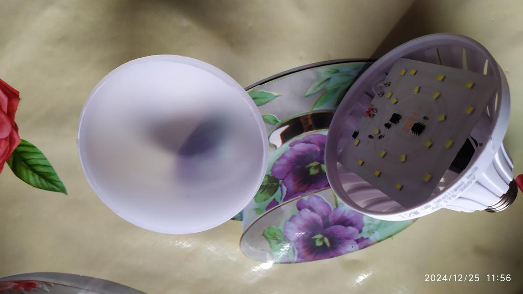 It shines weakly, but it works. The plastic is cheap and bends. I determined what the essence of the bulb is, the essence is that it has two circles of diodes. One shines from 220, and the second circle from the battery. That is, if it has 12 W, then we divide it in half. 6 W from 220, very weak.