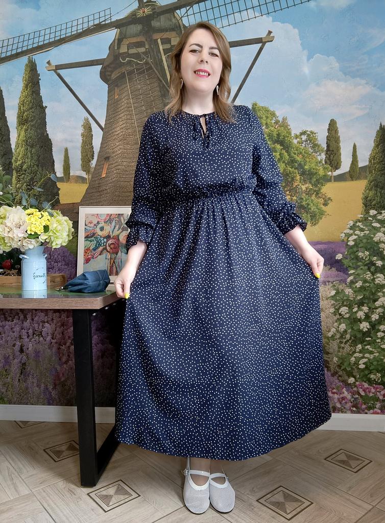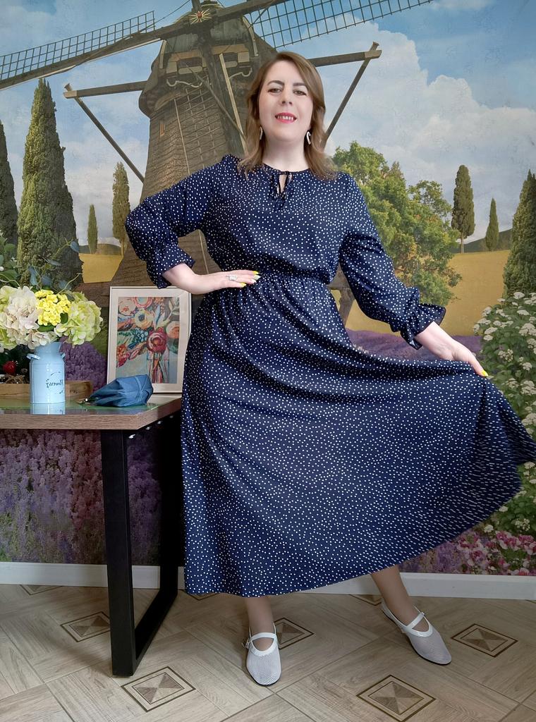 This dress is simply spot on! Let's start with the fact that it's *loose*, which means it's super comfortable and flattering – not too tight, sits nicely, and flows with the body. The polka dot print gives it such a timeless look – classic, but with a young and refreshing twist. The long trumpet sleeves add a subtle and special chic, and elevate the whole look.. The round collar maintains a modest and tidy appearance, and the long length of the skirt is very suitable for spring and autumn – just when it's not cold but also not too hot.. *The fabric (100% polyester)* feels light, doesn't cause sweating, and is easy to maintain – hand wash and that's it, no drama. In summary, this is a wonderful dress for everyday wear or for casual events, incredibly comfortable, looks great, and fits well even on a full figure. A dress that makes you want to go out! 💃