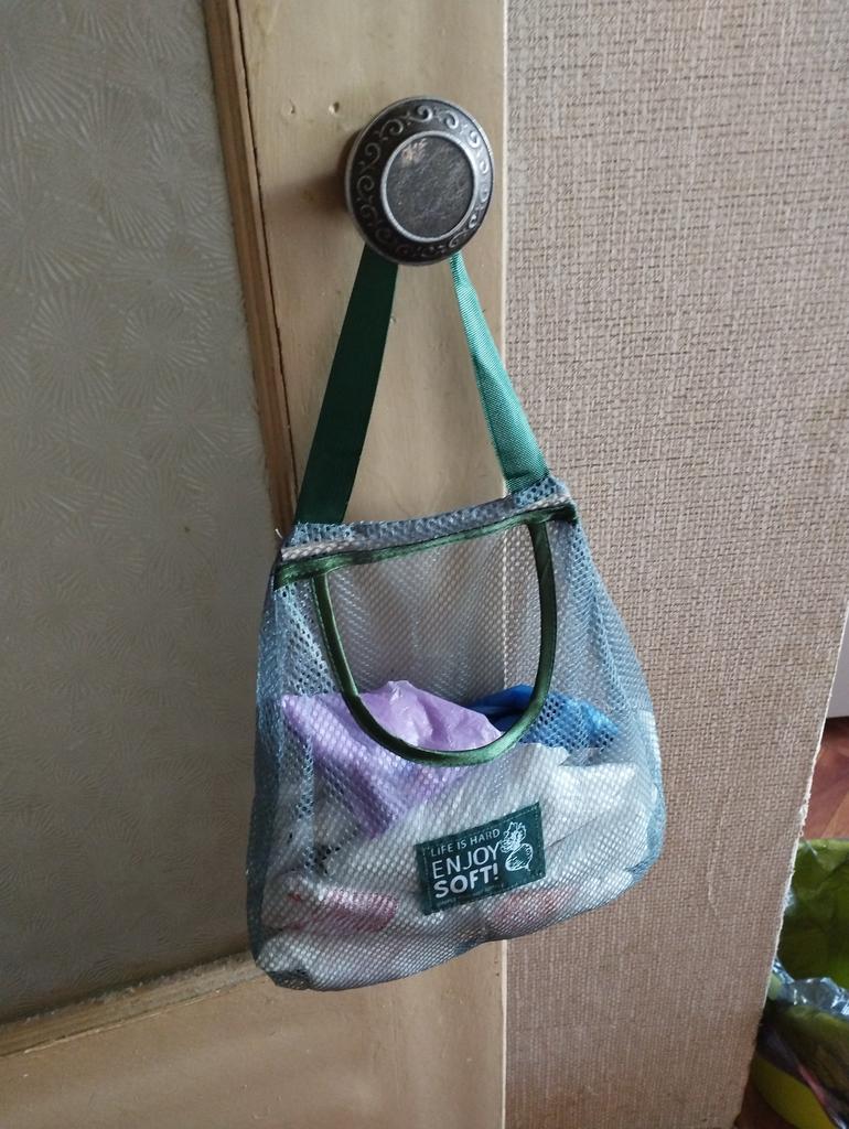 A small mesh bag for vegetables. I use it for onions. I hung it near the radiator, the onions both dry out and there is no husk from them in the kitchen. Very convenient. I like it.