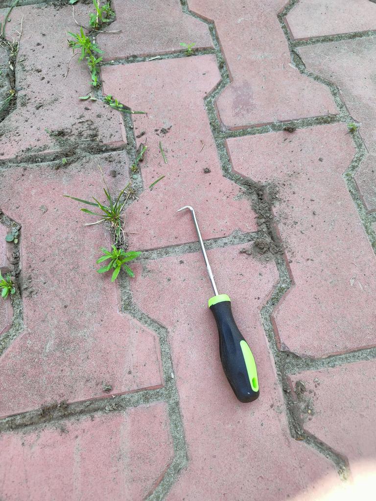 For removing vegetation between the joints of paving stones, a longer and stronger tool may be needed.. And you need to work with it very carefully and cautiously so as not to damage the hand you are holding it with. And you must work in protective gloves that are resistant to abrasion, because the paving stone works like sandpaper. The hook itself is quite small and narrow, so the gaps in the paving stones must be no more than 2 mm, otherwise the process of removing vegetation from there will be very slow.