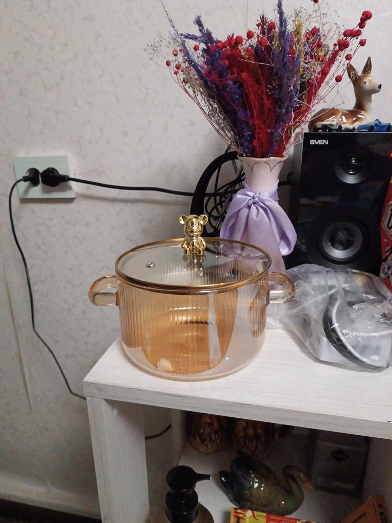 Cuteness! A very pretty item! A small pot with a capacity of up to 1.5 liters, transparent, with a lid... arrived undamaged. The packaging was, to be honest: "from the heart" - in a styrofoam box and two bags (one bulky, the other - bubble wrap). I tried cooking in it on an electric stove - it turns out even beautiful, especially when the water boils, you can get mesmerized by this process... I'm interested, can this little pot be used on an induction cooktop? What do people say, but there are no instructions...