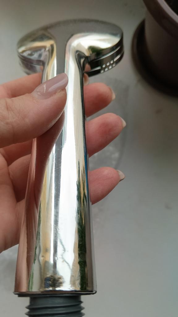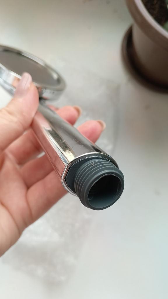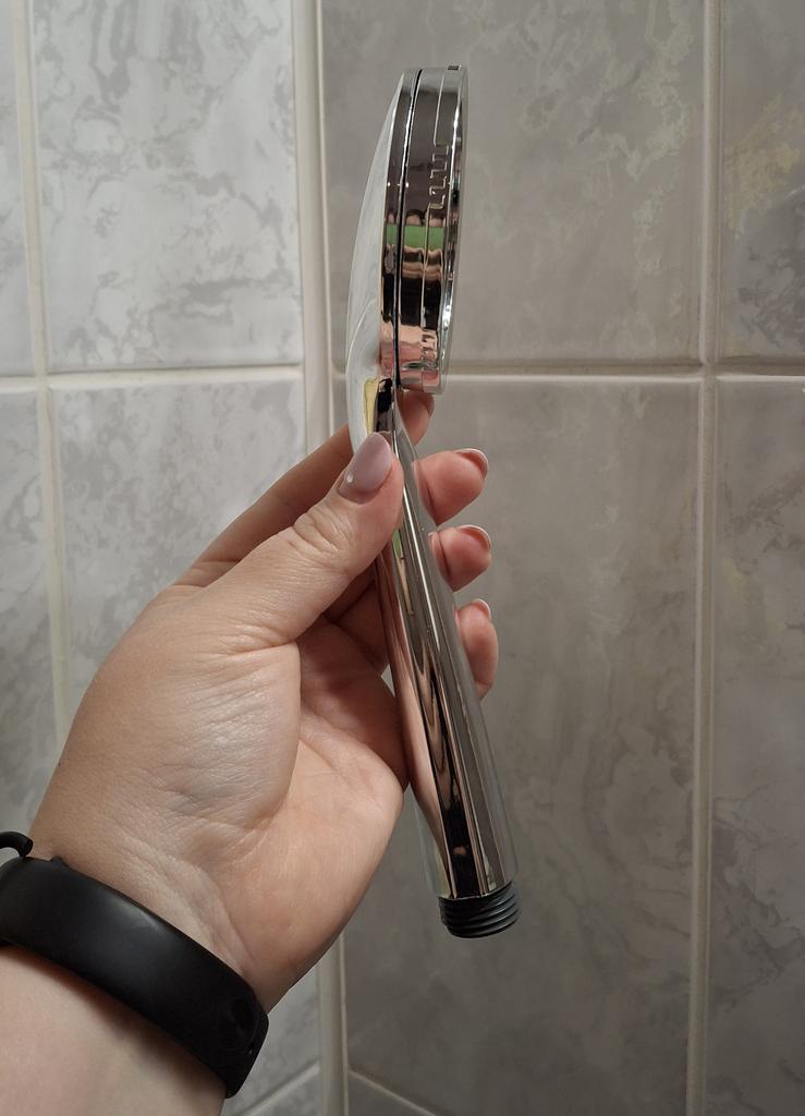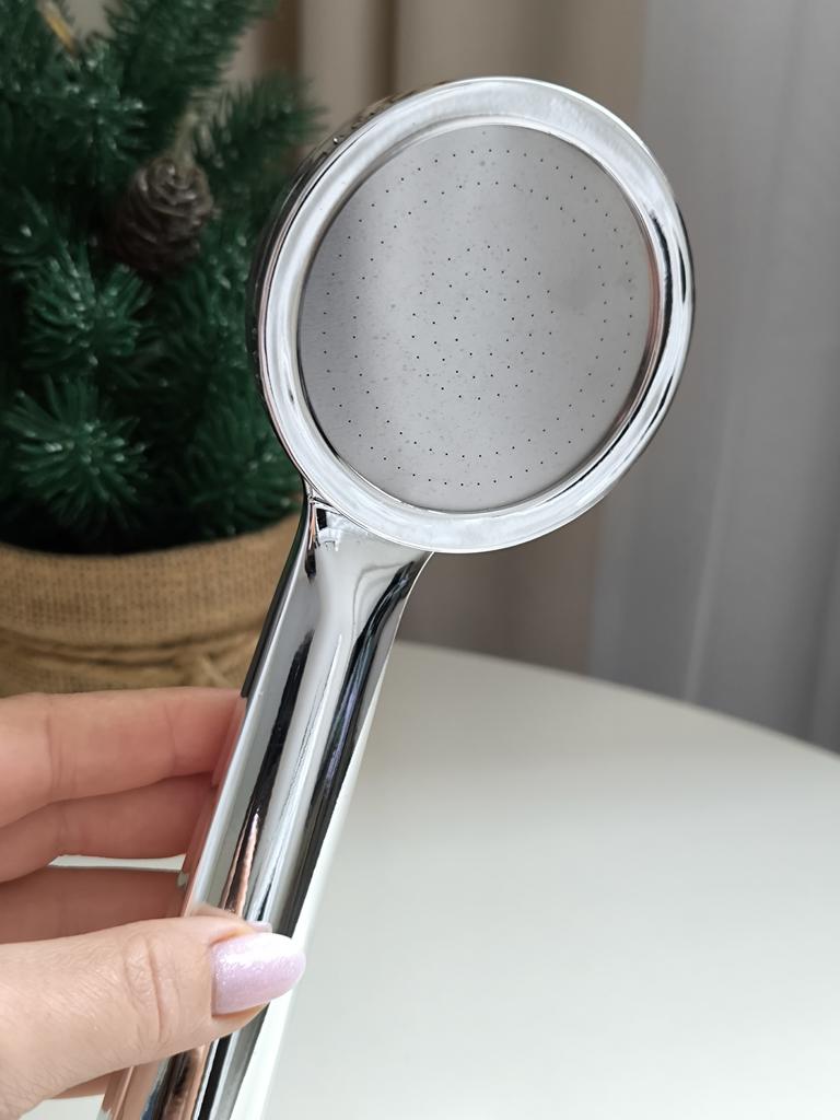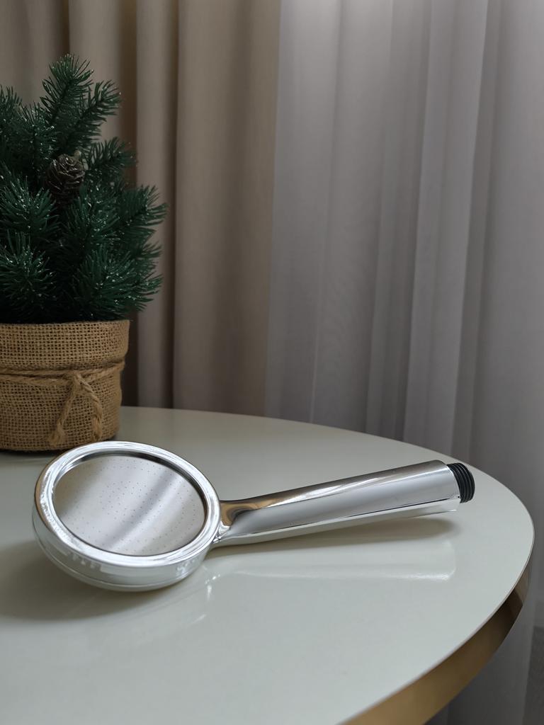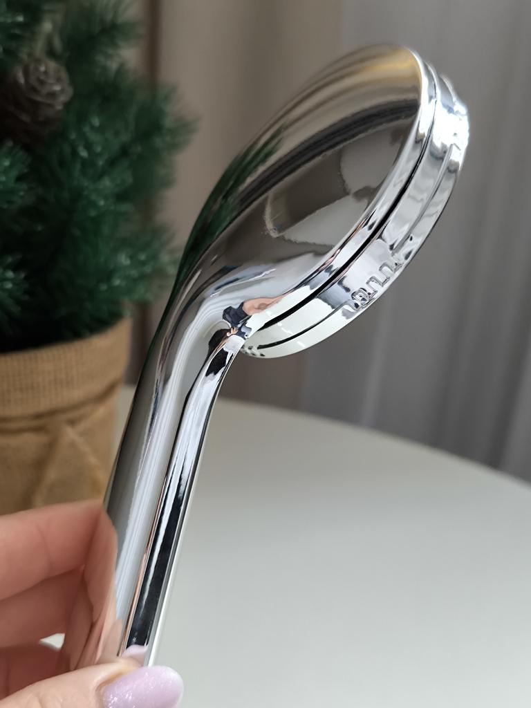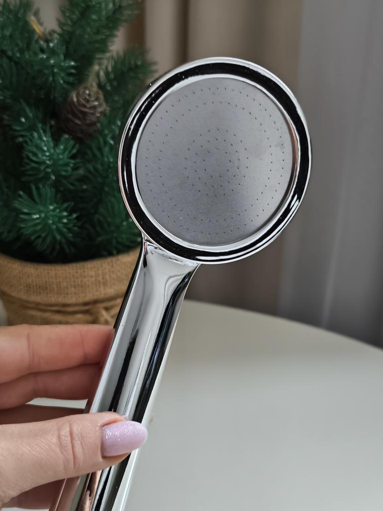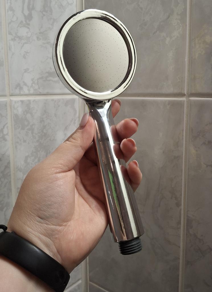 Shower head with nano spray Made of ABS plastic with a silver coating. The dimensions are very compact. Simple to install and requires no special tools. Fits standard-size shower hoses. Budget option. For its cost, it's a quite normal attachment. I recommend.