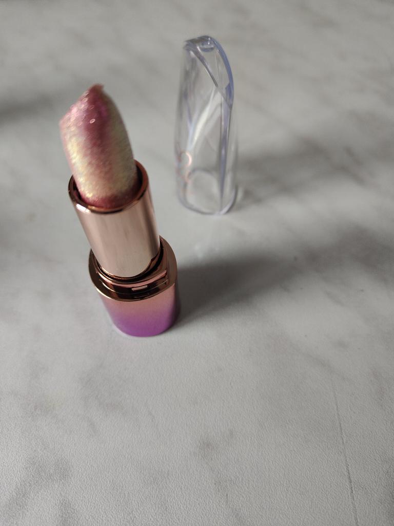 Too many visible large glitter particles, and not enough orange lipstick