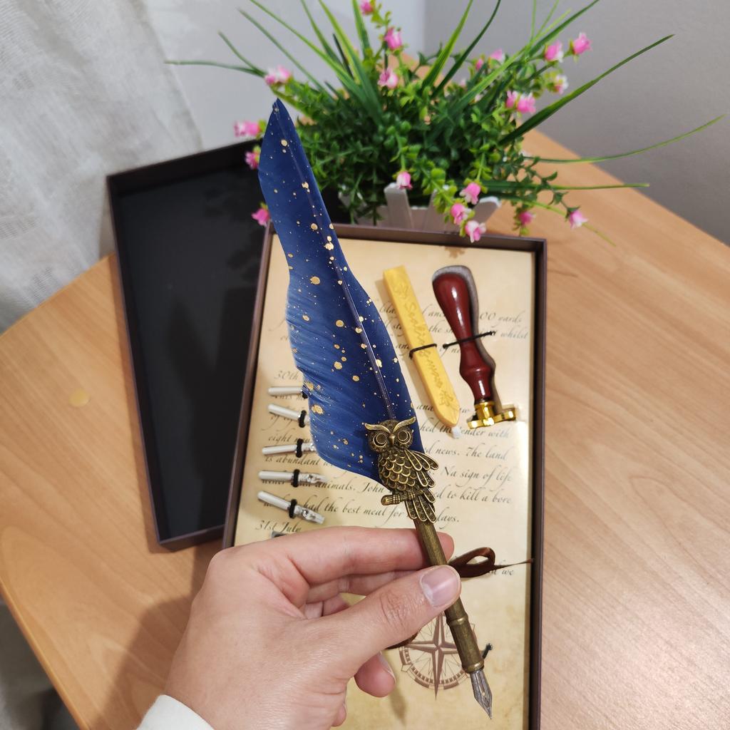 This feather pen with owl and gear characters is a magical item for any writing and art enthusiast. The special design adds a vintage touch and provides a unique and special writing experience, which combines creativity and aesthetics.. What I really loved was the packaging – this pen comes with an ink bottle and a gift box, making it a perfect gift for a birthday or any special occasion. The experience of writing with a fountain pen gives a luxurious and traditional feeling, which elevates any writing or sketching routine.. This is a high-quality, unique, and impressive item, suitable for collectors and anyone who likes to add an artistic and elegant touch to their desk or school ✨🖋️🦉