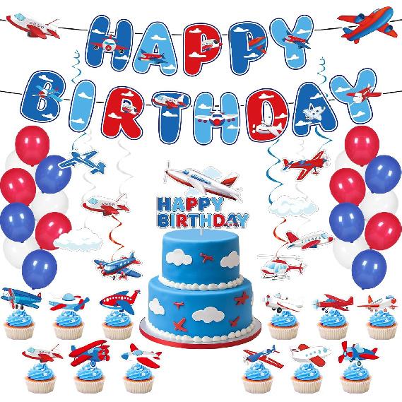 Airplane Birthday Party Decorations - 49PCS Airplane Themed Party Decorations with Banners Balloons Cupcake Toppers Hanging Swirls Plane Birthday