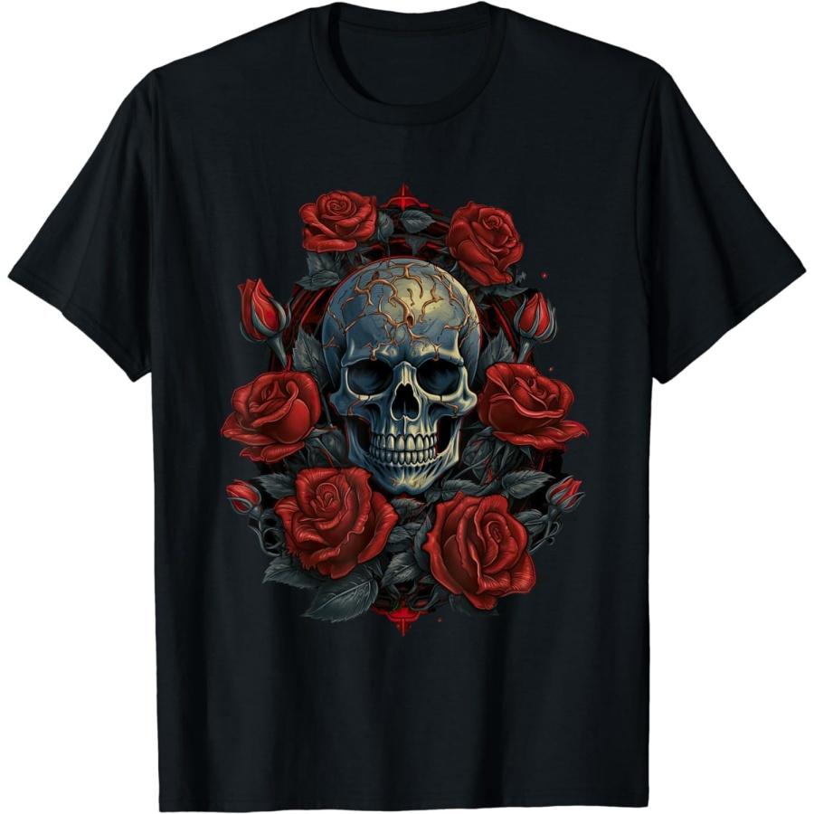 Figured Rose Skeleton Skull Hand Red Flower Rose T-Shirt, Novelty Tee Cute Tshirt