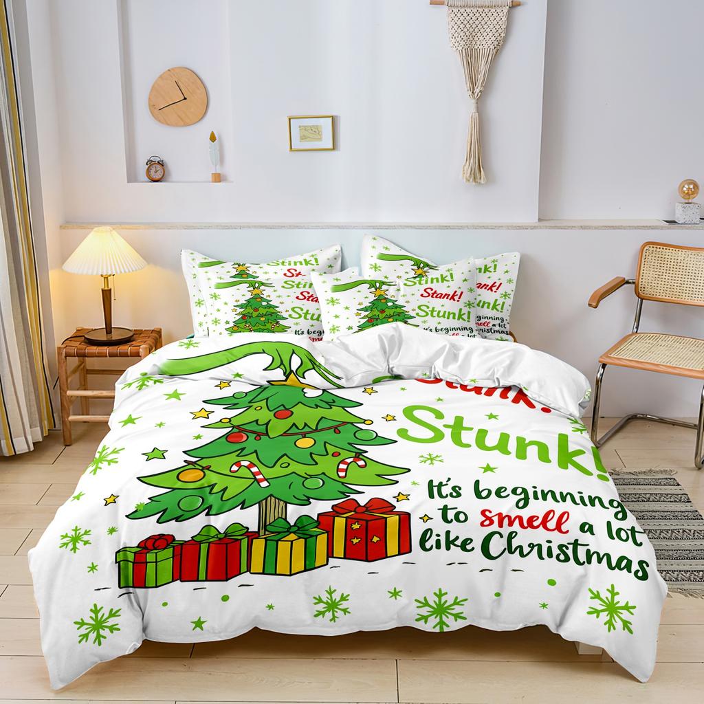 3pcs Christmas Tree & Snowflake Duvet Cover Set - Festive Holiday Bedding With "Stink! Stank!" Text Print Green & Red Design