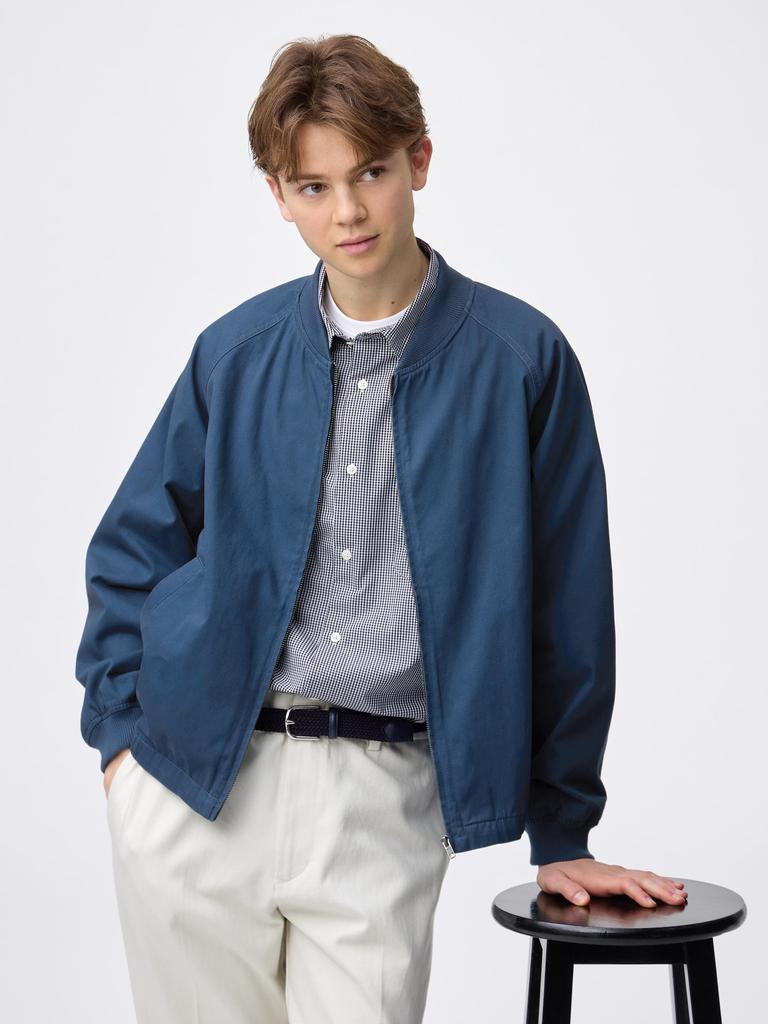 The GU by Uniqlo Cotton Rib Blouson is a casual outerwear made from lightweight cotton material and falls under the men's blouson category. The main body is made of 100% cotton, while the ribbed sections are a blend of 98% polyester and 2% polyurethane. It features a central front zipper closure design and two side pockets for practicality. The relaxed washing process has been applied to create a casual feeling.