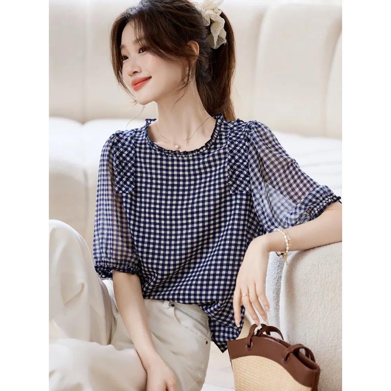 Summer New Style Chic Checkered Chiffon T-shirt Women's Loose Casual Short Sleeve All Match Round Neck Top Small Shirt