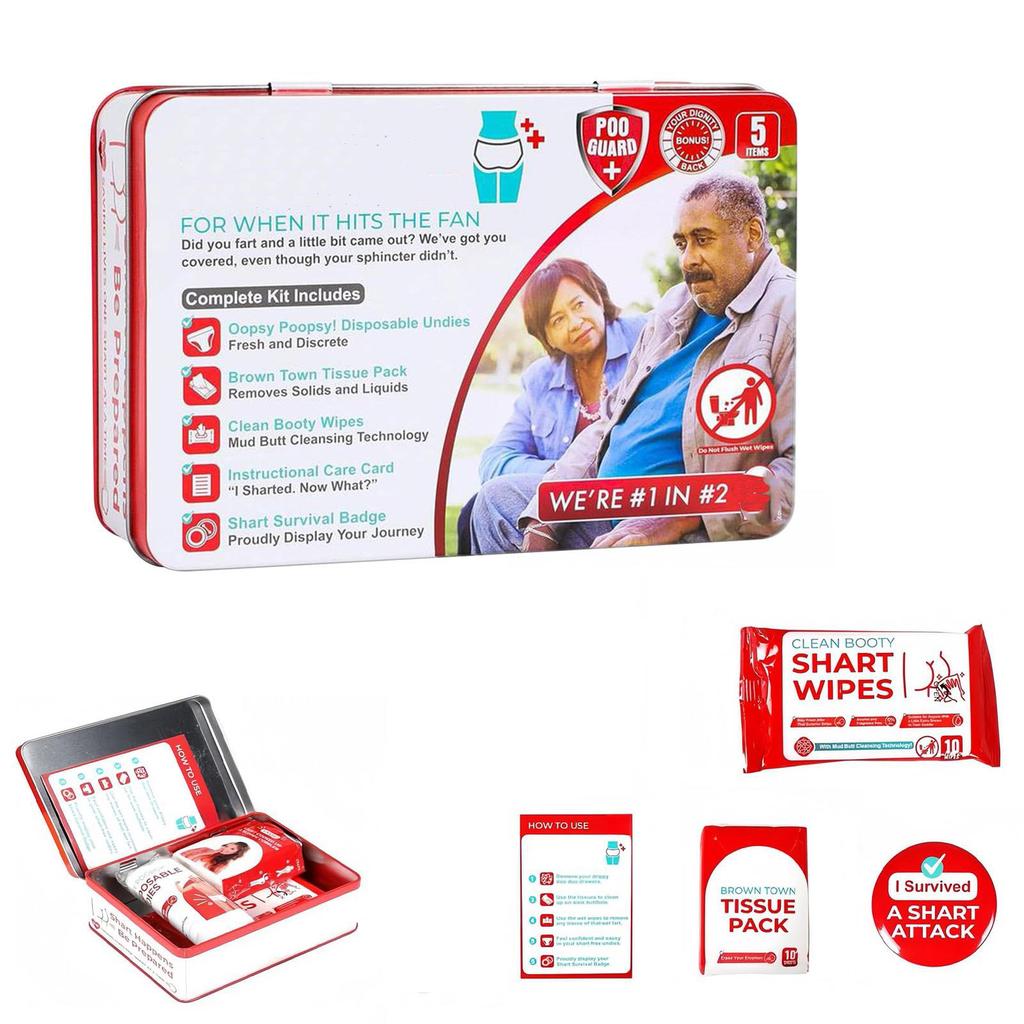 THEY SAY YOU SHOULD NEVER TRUST A FART... but hey, shi- I mean stuff happens, right? Next time there's an accident mudslide mountain, be prepared! Our state-of-the-art, travel size emergency kit has your back..side.