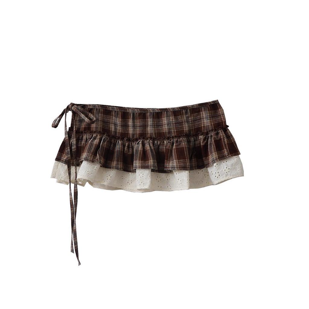 Women's Retro Plaid Embroidered Lace Tie-Up Skirt Curtain