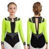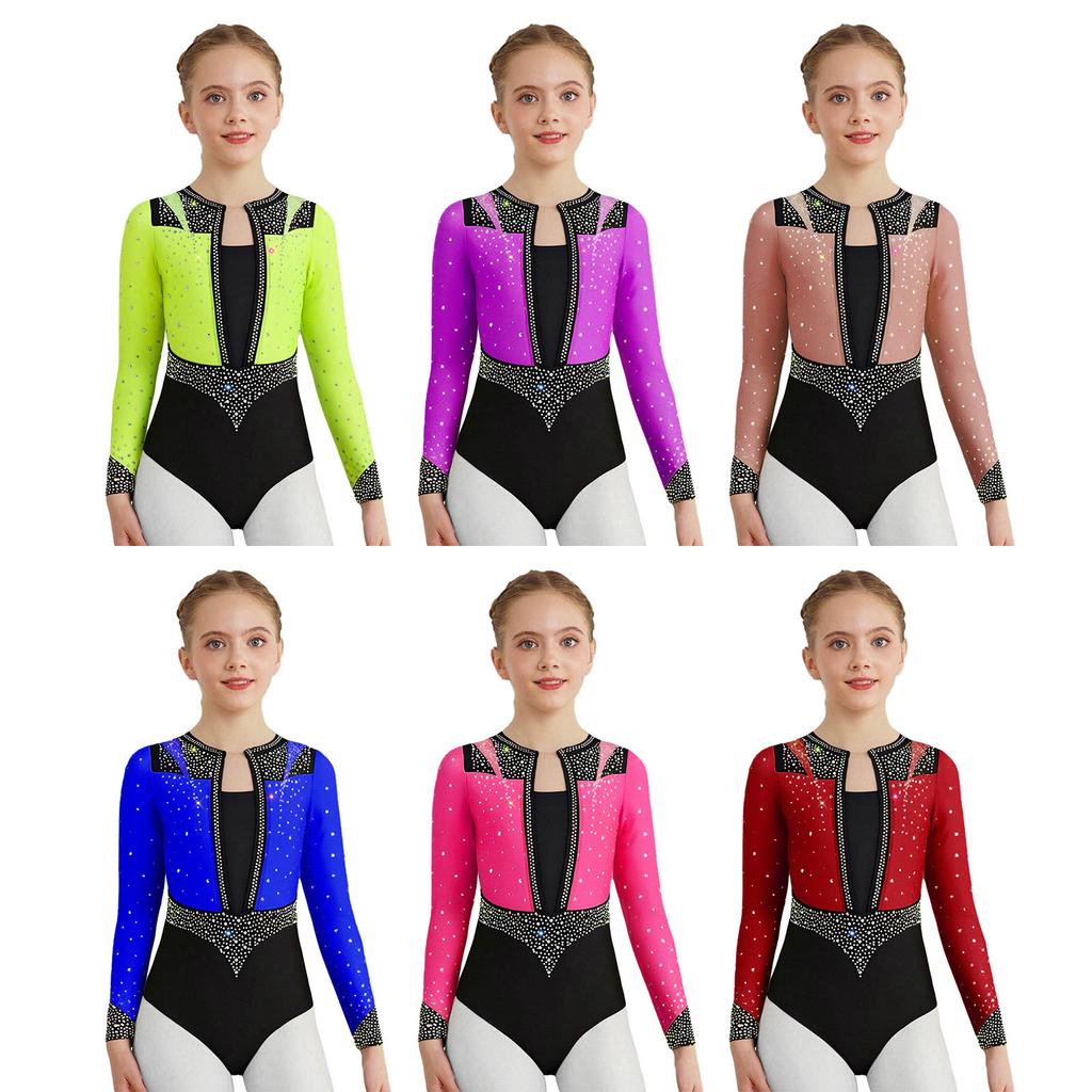 Girls Gymnastics Leotard Long Sleeve Keyhole Back Shiny Rhinestones Figure Skating Dancewear