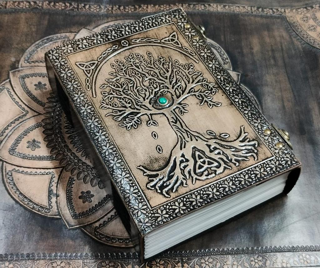 Embossed Tree of Life Leather Journal: Handmade Grimoire with Turquoise Stone