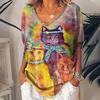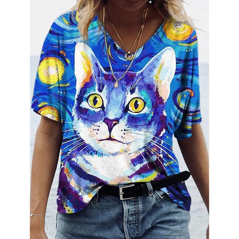 Women's 3d Cats Print T-Shirt Fashion Woman Blouses 2025 Funny Kawaii V-Neck T Shirt Female Clothing Oversized Summer Tops Tees