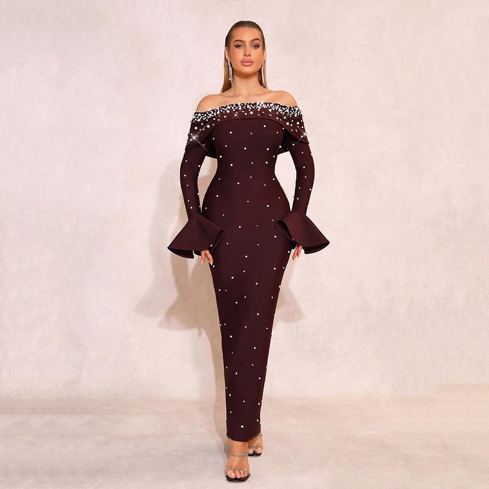European and American Style Beaded Sequin One-Shoulder Bandage Evening Gown