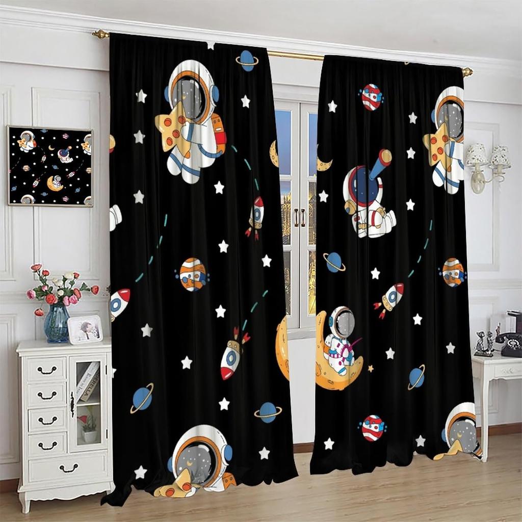 Outer Space Curtains Cartoon Astronaut Rocket Planets Stars Spaceman Universe Galaxy Print Window Kids Boys Made Of Polyester