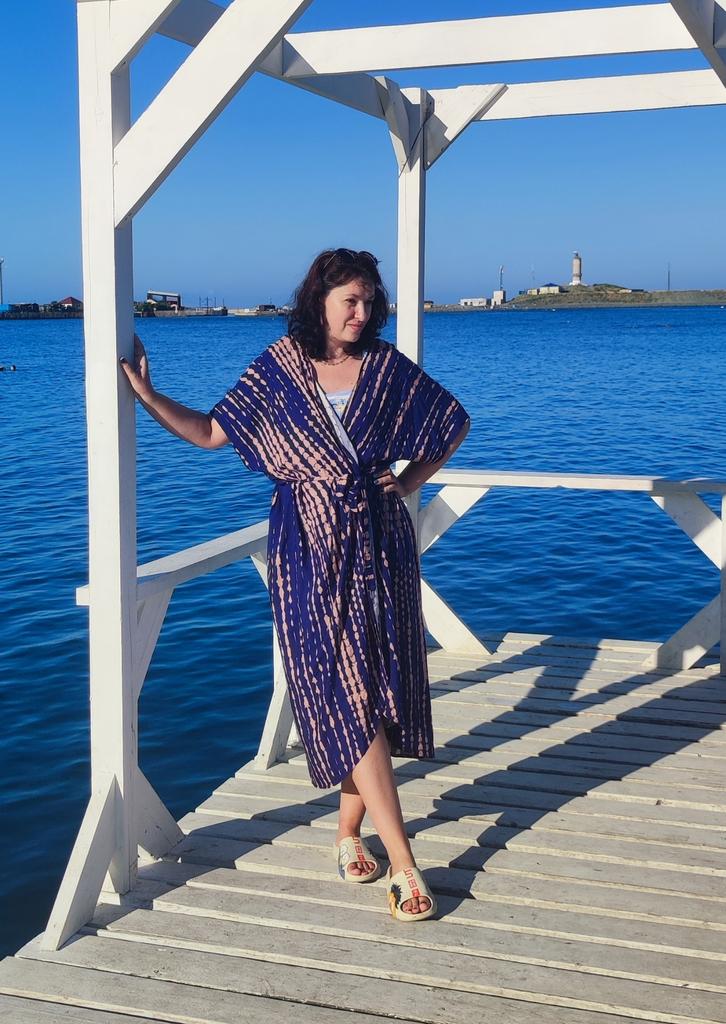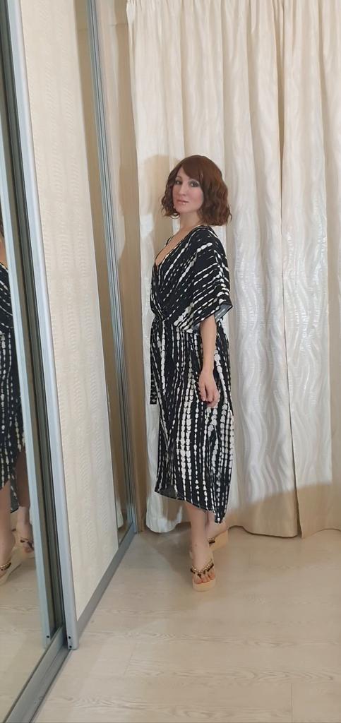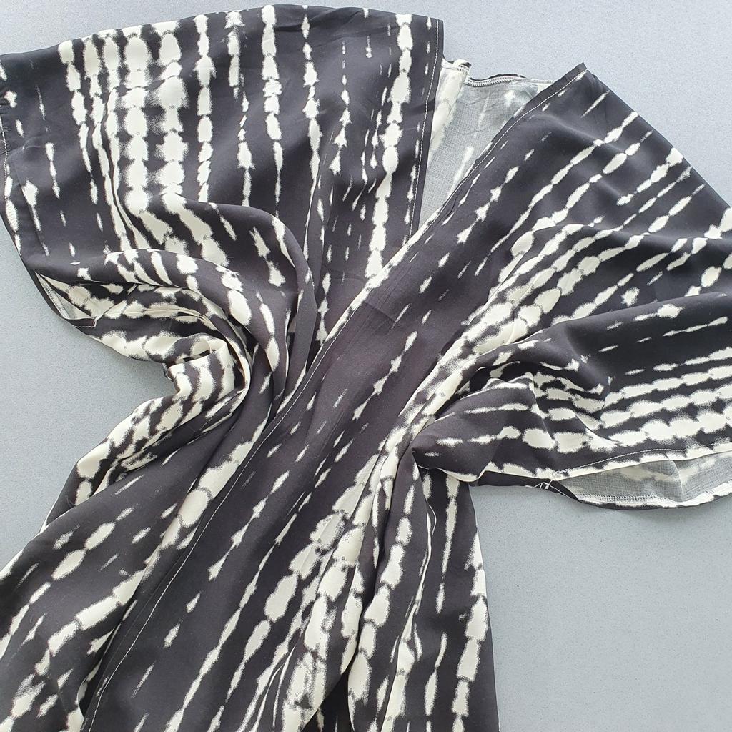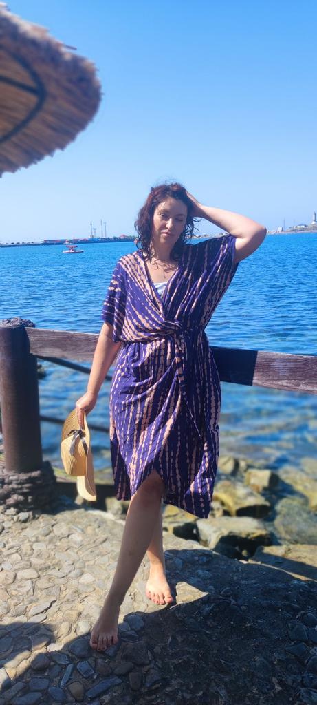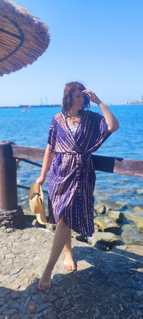 kimono 👘 beautiful! It is ideal both for the beach and pool and to complete your outfits. It has a wonderful fabric, very soft, fresh and with a spectacular fall and movement. The sleeve is continuous and has a belt. Washes and irons great. I recommend it 100%, it is one size fits all and exact to the photos. The shipment 📦 arrived on time and in perfect condition