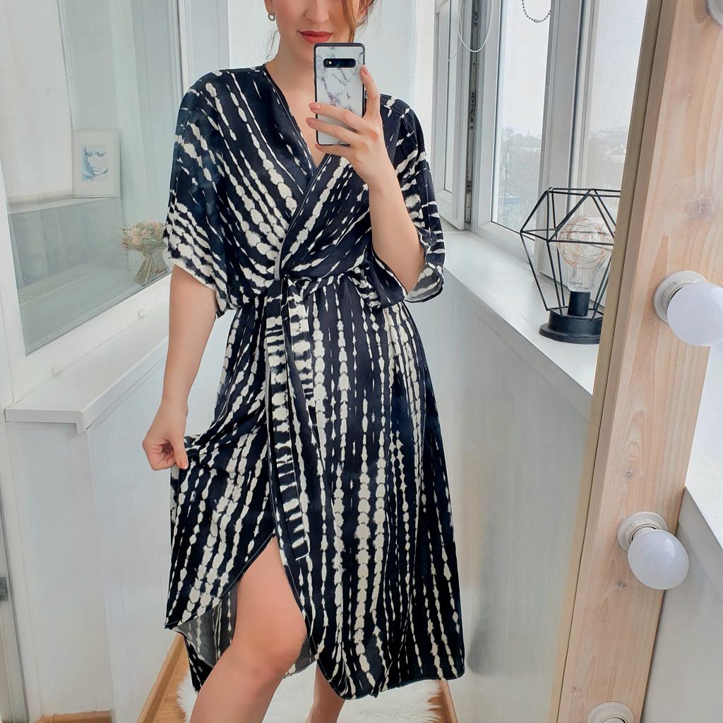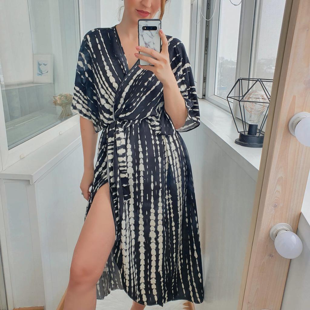 2022 Bikini Cover-Ups Zwarte Retro Gestreepte Zelf Belted Plus Size Womensummer Kimono Jurk Strandkleding Badpak cover Up Q1225