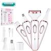 Deze ontharing heeft 4 opzetstukken, 1 gezichtsscheerapparaat, 1 wenkbrauwtrimmer, 1 neustrimmer, 1 lichaamsscheerapparaat. Beschikbaar voor het verwijderen van haar op gezicht, armen, benen, bikinilijnen, neus, wenkbrauwen, enz.