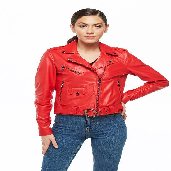 NOORA Womens Lambskin Leather Red Biker Jacket With Zipper & Pocket | Shoulder Strap | Belted Jacket |
