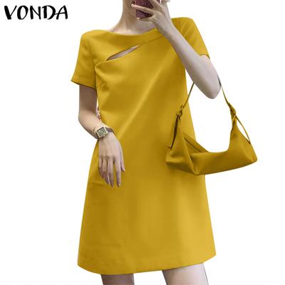 ZANZEA Women Summer Casual Loose Solid Short Sleeve Crew Neck Mini Shift Dress
