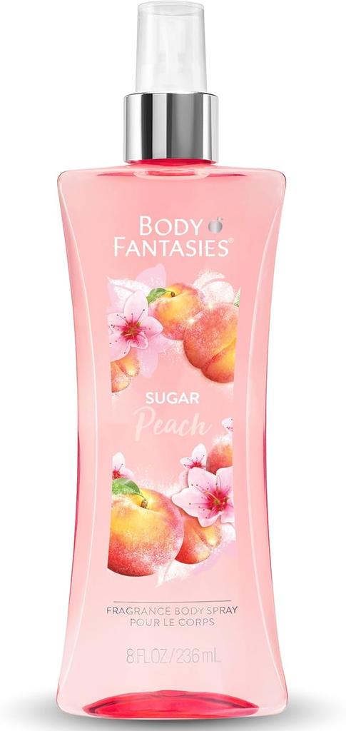 The Body Fantasies Signature Sugar Peach Perfume De Coeur Body Spray is a sweet and sensual body spray. With a soft blend of fruity and floral notes, this product is suitable for refreshing use all day long, no matter the situation. The sugary top notes of Peach harmonize with the warm and dramatic notes of Amber, Cedarwood, Lavender, and Rose, creating an appealing fragrance.