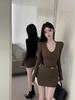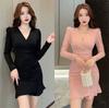 Jurk met V-hals, geplooide taille, gewikkelde billen, lange mouwen, sexy en elegant, temperamentvolle korte rok voor dames