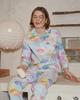 Теплий піжамний костюм з білої фланелі з планетами з блакитним кантом. Комплект складається з сорочки з довгими рукавами і прямих брюк. Сорочка вільного крою з відкладним коміром, на блакитних ґудзиках, з манжетами на рукавах. Брюки з високою талією з манжетами, з еластичним поясом на резинці. Завдяки високій якості матеріалу, піжама не дає усадку, практична і дуже проста в догляді. Особливість пошиття - закриті м'які шви, які не тільки виглядають акуратно й бездоганно, а й забезпечують комфортний дотик тканини до тіла, не дозволяють виробу деформуватися