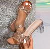 2024 Nieuwe Damessandalen Zomer Mode Vierkante Neus Strass Transparante Dikke Hak Slippers Vrouwelijk Sexy Bruiloft Feest Sandalen