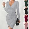 Lente en Herfst Damesjurk Skinny Gebreide Jurk Taille Gewikkeld Heup Onderrok V-hals Skinny Geplooid Lange Mouw Onderrok