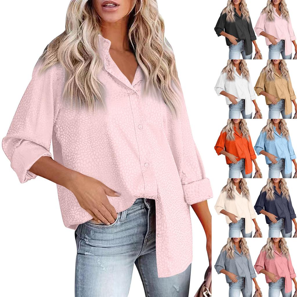 Dames Revers Knoop Luipaard Temperament Lange Mouw Shirt