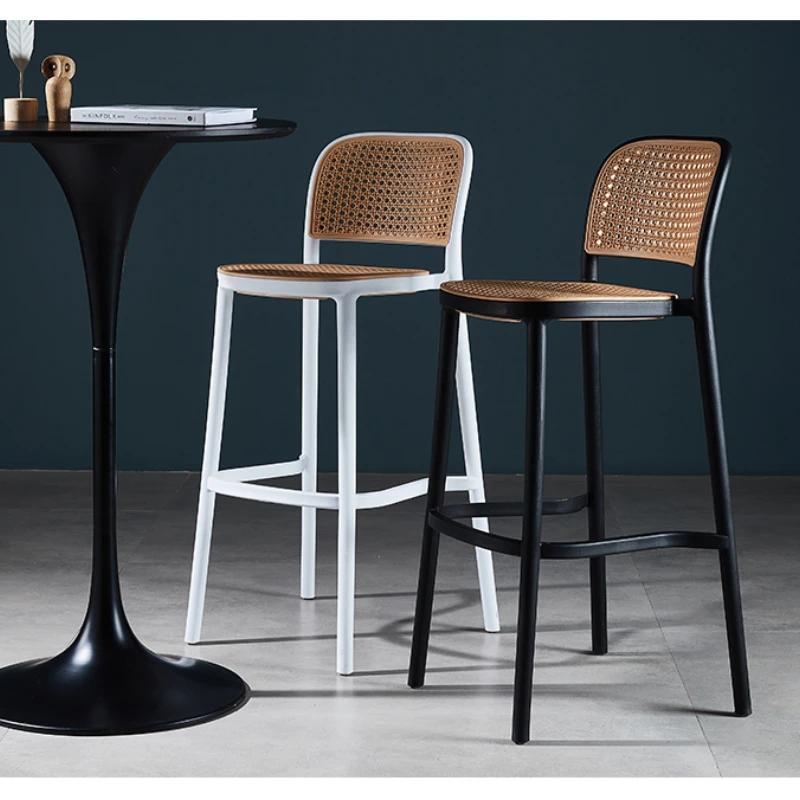 Retro Solid Wood Rattan Bar Chairs Minimalist Bar Furniture Nordic Leisure Backrest Design High Bar Stool Modern Hotel Office