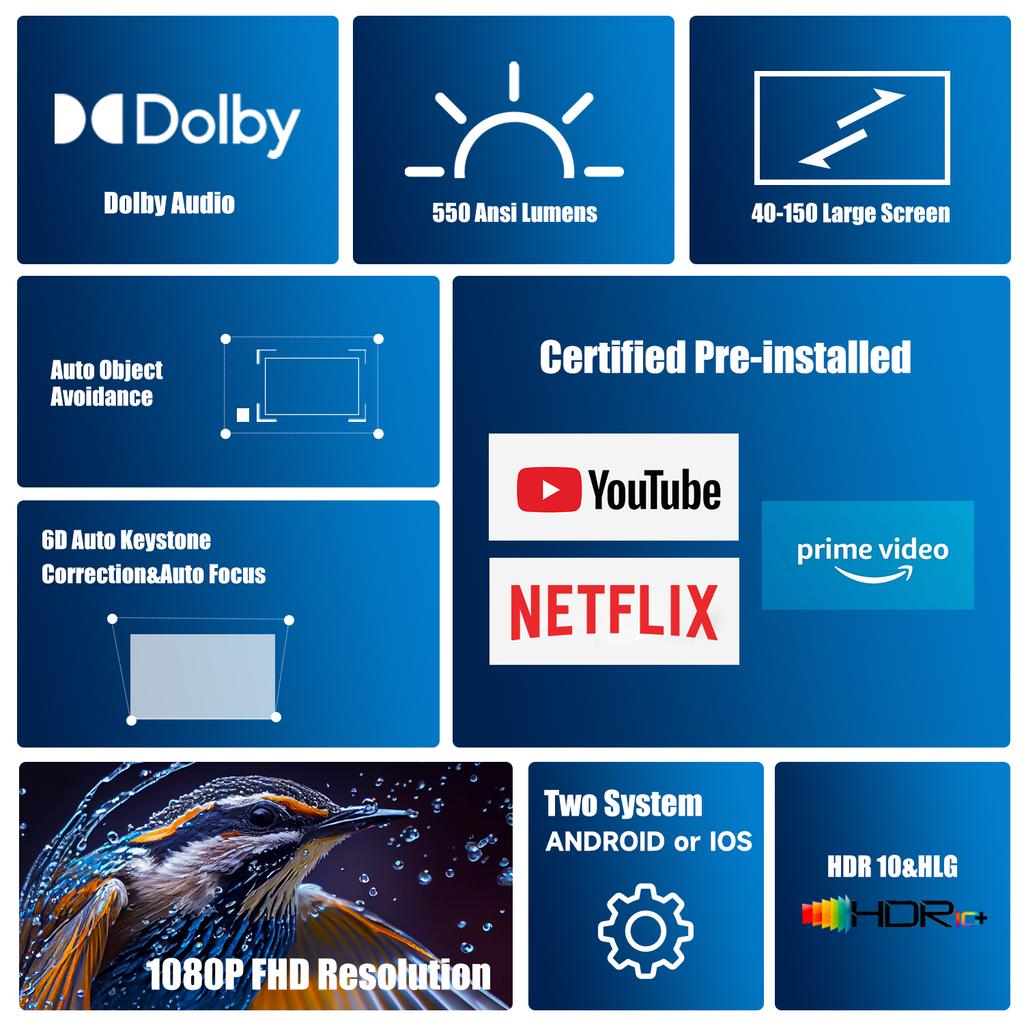 Magcubic HT600 Projector 550ANSI 1080P with Linux Android 11 Dolby Audio HDR10 Wifi BT Auto Focus for Netflix Youtube Certified